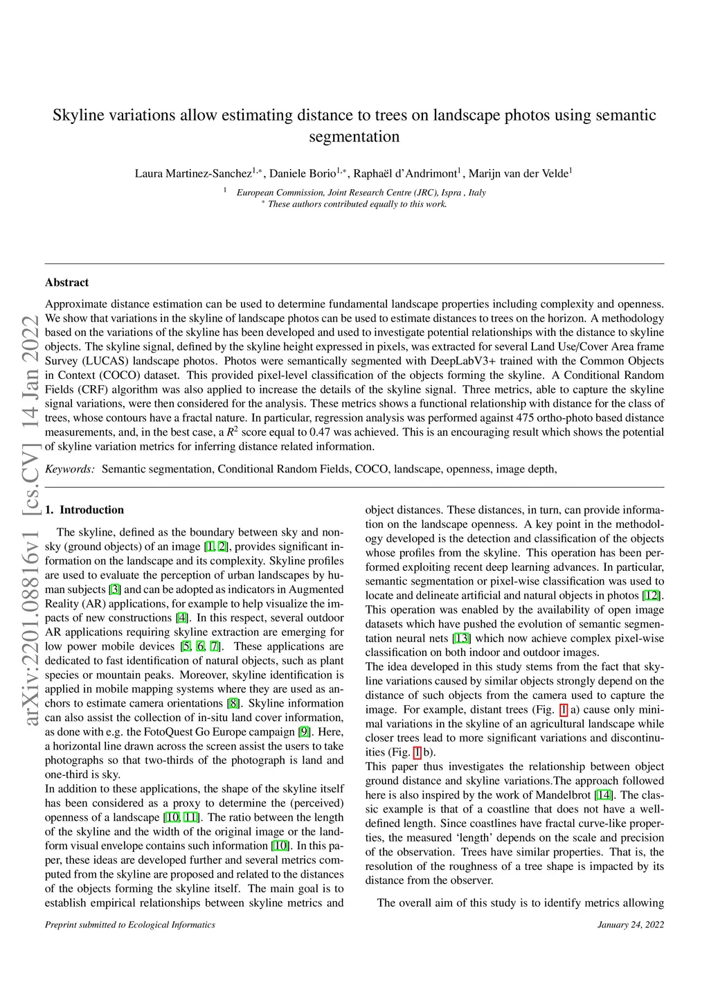 Approximate distance estimation can be used to determine fundamental landscape properties including complexity and openness. We show that variations in the skyline of landscape photos can be used to estimate distances to trees on the horizon. A methodology based on the variations of the skyline has been developed and used to investigate potential relationships with the distance to skyline objects. The skyline signal, defined by the skyline height expressed in pixels, was extracted for several Land Use/Cover Area frame Survey (LUCAS) landscape photos. Photos were semantically segmented with DeepLabV3+ trained with the Common Objects in Context (COCO) dataset. This provided pixel-level classification of the objects forming the skyline. A Conditional Random Fields (CRF) algorithm was also applied to increase the details of the skyline signal. Three metrics, able to capture the skyline signal variations, were then considered for the analysis. These metrics shows a functional relationship with distance for the class of trees, whose contours have a fractal nature. In particular, regression analysis was performed against 475 ortho-photo based distance measurements, and, in the best case, a R2 score equal to 0.47 was achieved. This is an encouraging result which shows the potential of skyline variation metrics for inferring distance related information.