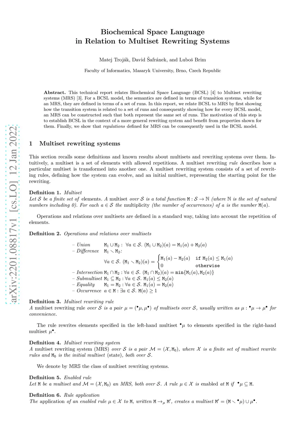 This technical report relates Biochemical Space Language (BCSL) to Multiset rewriting systems (MRS). For a BCSL model, the semantics are defined in terms of transition systems, while for an MRS, they are defined in terms of a set of runs. In this report, we relate BCSL to MRS by first showing how the transition system is related to a set of runs and consequently showing how for every BCSL model, an MRS can be constructed such that both represent the same set of runs. The motivation of this step is to establish BCSL in the context of a more general rewriting system and benefit from properties shown for them. Finally, we show that regulations defined for MRS can be consequently used in the BCSL model.