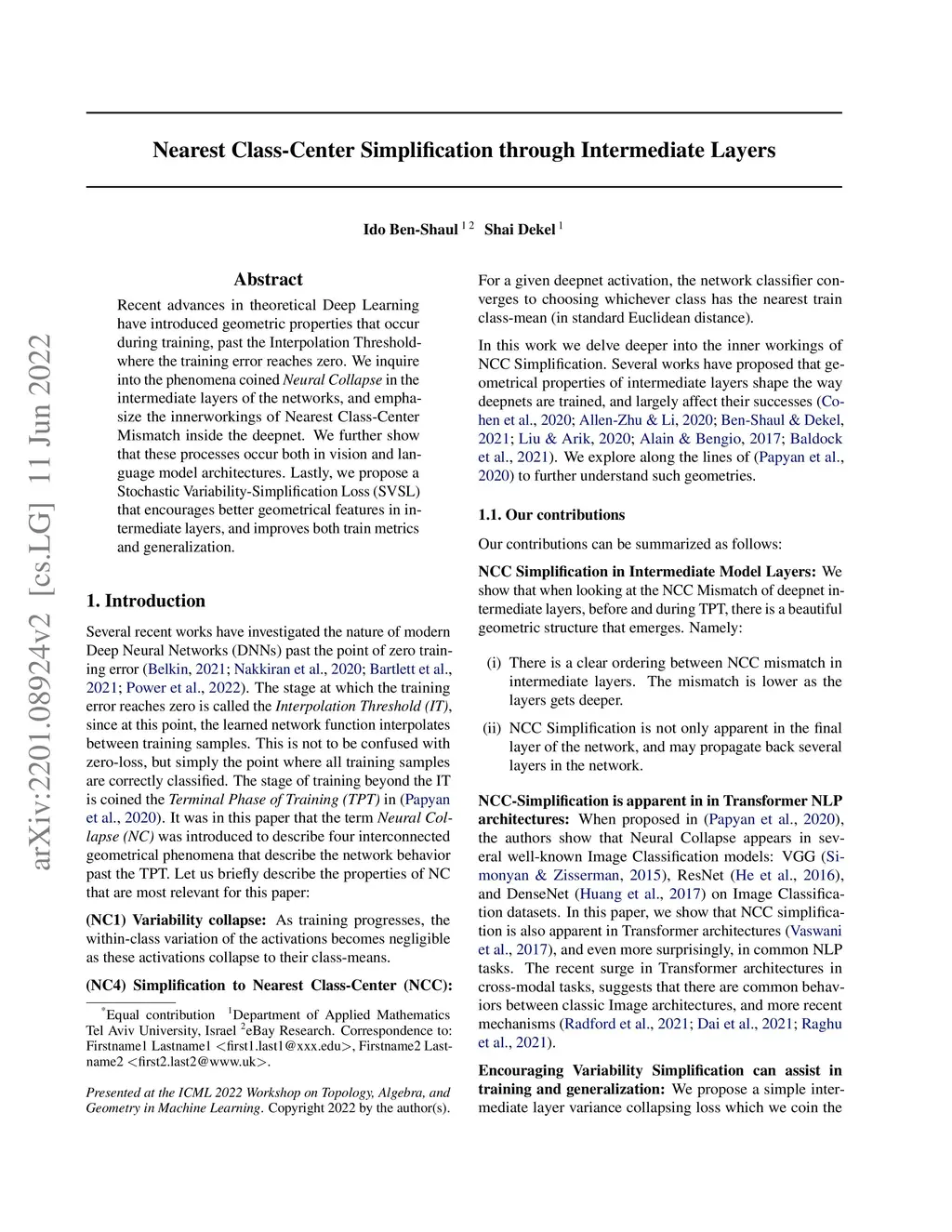 Recent advances in theoretical Deep Learning have introduced geometric properties that occur during training, past the Interpolation Threshold -- where the training error reaches zero. We inquire into the phenomena coined Neural Collapse in the intermediate layers of the networks, and emphasize the innerworkings of Nearest Class-Center Mismatch inside the deepnet. We further show that these processes occur both in vision and language model architectures. Lastly, we propose a Stochastic Variability-Simplification Loss (SVSL) that encourages better geometrical features in intermediate layers, and improves both train metrics and generalization.