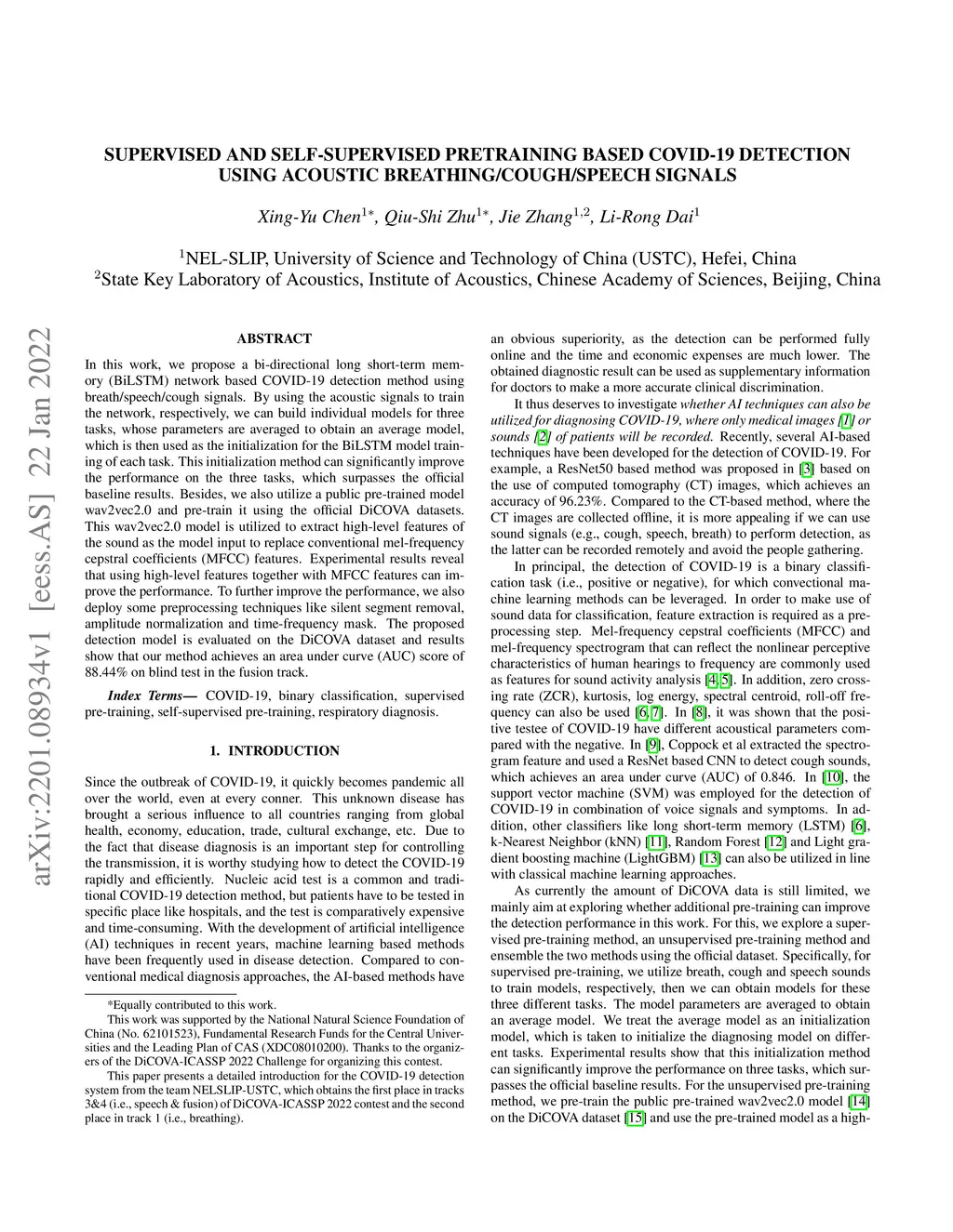 In this work, we propose a bi-directional long short-term memory (BiLSTM) network based COVID-19 detection method using breath/speech/cough signals. By using the acoustic signals to train the network, respectively, we can build individual models for three tasks, whose parameters are averaged to obtain an average model, which is then used as the initialization for the BiLSTM model training of each task. This initialization method can significantly improve the performance on the three tasks, which surpasses the official baseline results. Besides, we also utilize a public pre-trained model wav2vec2.0 and pre-train it using the official DiCOVA datasets. This wav2vec2.0 model is utilized to extract high-level features of the sound as the model input to replace conventional mel-frequency cepstral coefficients (MFCC) features. Experimental results reveal that using high-level features together with MFCC features can improve the performance. To further improve the performance, we also deploy some preprocessing techniques like silent segment removal, amplitude normalization and time-frequency mask. The proposed detection model is evaluated on the DiCOVA dataset and results show that our method achieves an area under curve (AUC) score of 88.44% on blind test in the fusion track.