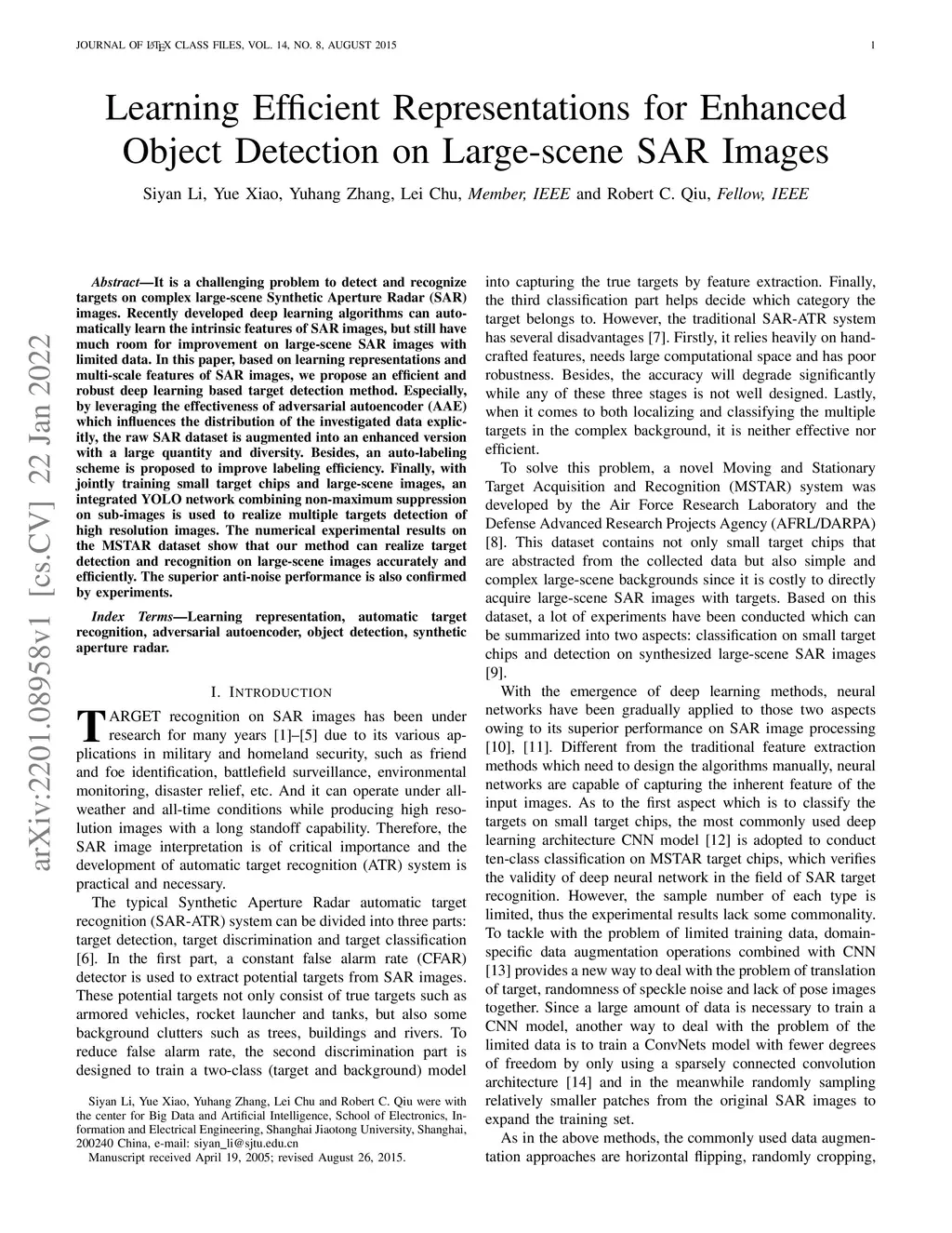 It is a challenging problem to detect and recognize targets on complex large-scene Synthetic Aperture Radar (SAR) images. Recently developed deep learning algorithms can automatically learn the intrinsic features of SAR images, but still have much room for improvement on large-scene SAR images with limited data. In this paper, based on learning representations and multi-scale features of SAR images, we propose an efficient and robust deep learning based target detection method. Especially, by leveraging the effectiveness of adversarial autoencoder (AAE) which influences the distribution of the investigated data explicitly, the raw SAR dataset is augmented into an enhanced version with a large quantity and diversity. Besides, an auto-labeling scheme is proposed to improve labeling efficiency. Finally, with jointly training small target chips and large-scene images, an integrated YOLO network combining non-maximum suppression on sub-images is used to realize multiple targets detection of high resolution images. The numerical experimental results on the MSTAR dataset show that our method can realize target detection and recognition on large-scene images accurately and efficiently. The superior anti-noise performance is also confirmed by experiments.