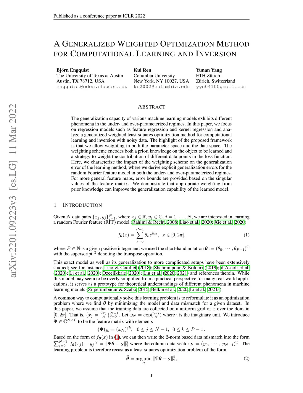 The generalization capacity of various machine learning models exhibits different phenomena in the under- and over-parameterized regimes. In this paper, we focus on regression models such as feature regression and kernel regression and analyze a generalized weighted least-squares optimization method for computational learning and inversion with noisy data. The highlight of the proposed framework is that we allow weighting in both the parameter space and the data space. The weighting scheme encodes both a priori knowledge on the object to be learned and a strategy to weight the contribution of different data points in the loss function. Here, we characterize the impact of the weighting scheme on the generalization error of the learning method, where we derive explicit generalization errors for the random Fourier feature model in both the under- and over-parameterized regimes. For more general feature maps, error bounds are provided based on the singular values of the feature matrix. We demonstrate that appropriate weighting from prior knowledge can improve the generalization capability of the learned model.