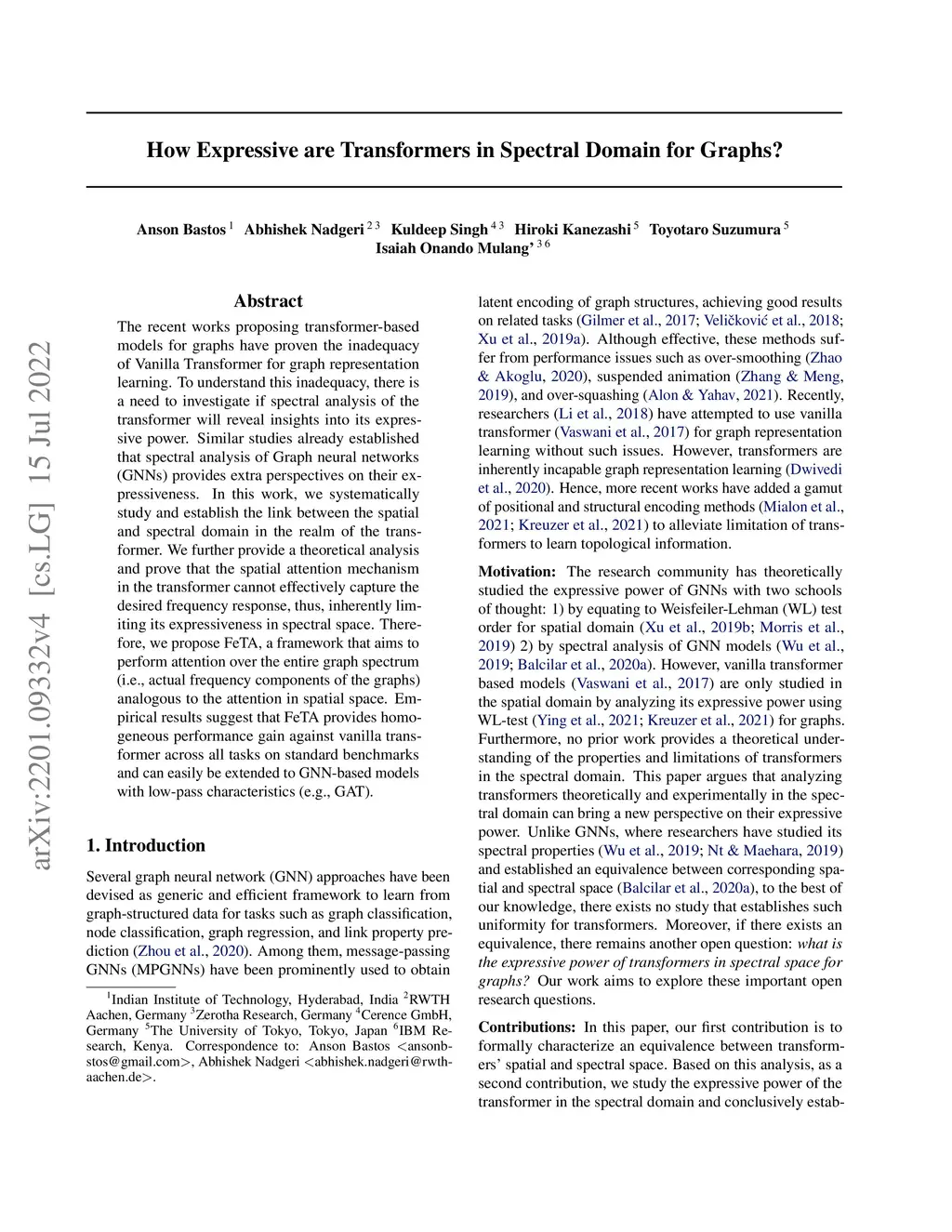 The recent works proposing transformer-based models for graphs have proven the inadequacy of Vanilla Transformer for graph representation learning. To understand this inadequacy, there is a need to investigate if spectral analysis of the transformer will reveal insights into its expressive power. Similar studies already established that spectral analysis of Graph neural networks (GNNs) provides extra perspectives on their expressiveness. In this work, we systematically study and establish the link between the spatial and spectral domain in the realm of the transformer. We further provide a theoretical analysis and prove that the spatial attention mechanism in the transformer cannot effectively capture the desired frequency response, thus, inherently limiting its expressiveness in spectral space. Therefore, we propose FeTA, a framework that aims to perform attention over the entire graph spectrum (i.e., actual frequency components of the graphs) analogous to the attention in spatial space. Empirical results suggest that FeTA provides homogeneous performance gain against vanilla transformer across all tasks on standard benchmarks and can easily be extended to GNN-based models with low-pass characteristics (e.g., GAT).