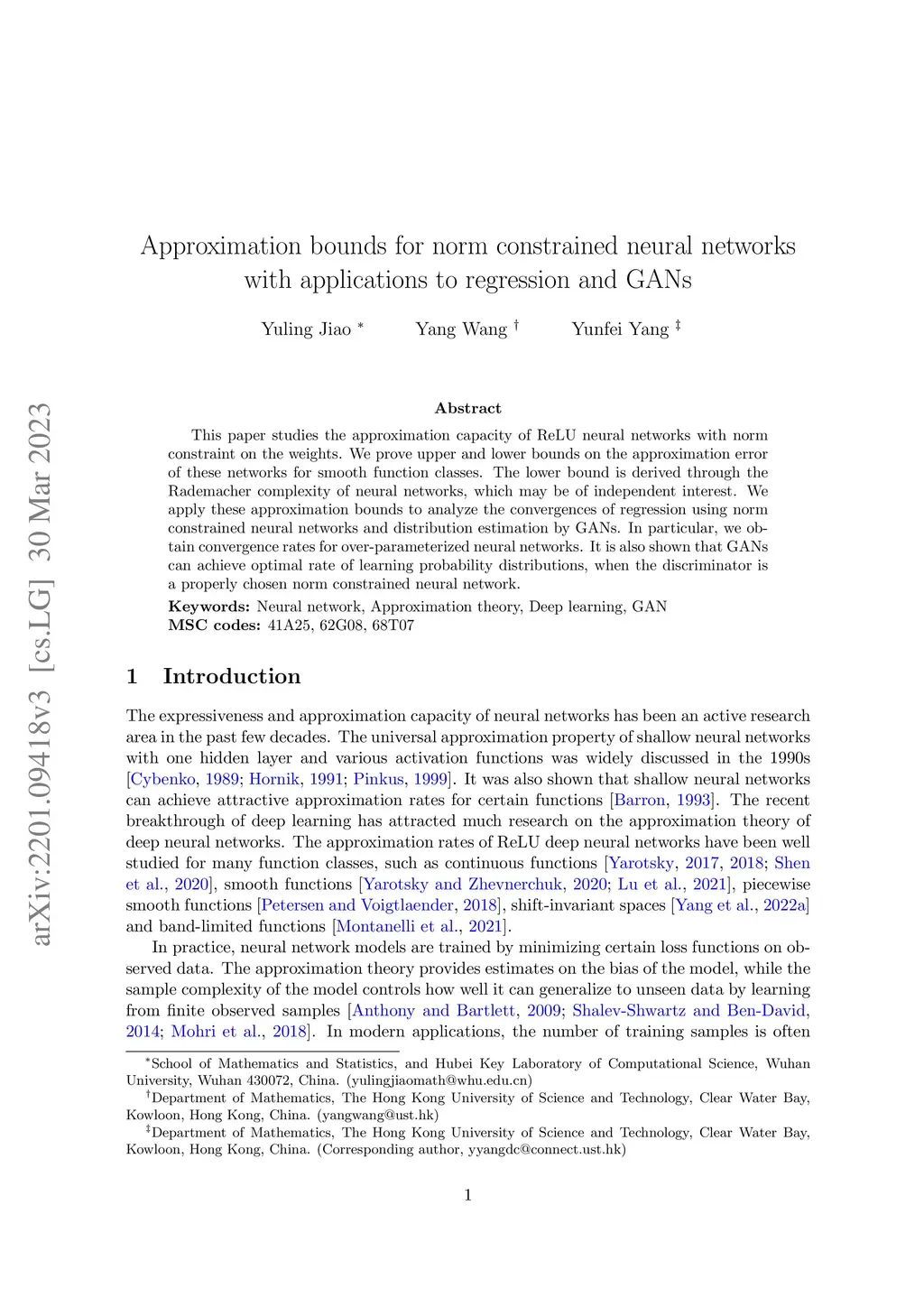This paper studies the approximation capacity of ReLU neural networks with norm constraint on the weights. We prove upper and lower bounds on the approximation error of these networks for smooth function classes. The lower bound is derived through the Rademacher complexity of neural networks, which may be of independent interest. We apply these approximation bounds to analyze the convergences of regression using norm constrained neural networks and distribution estimation by GANs. In particular, we obtain convergence rates for over-parameterized neural networks. It is also shown that GANs can achieve optimal rate of learning probability distributions, when the discriminator is a properly chosen norm constrained neural network.