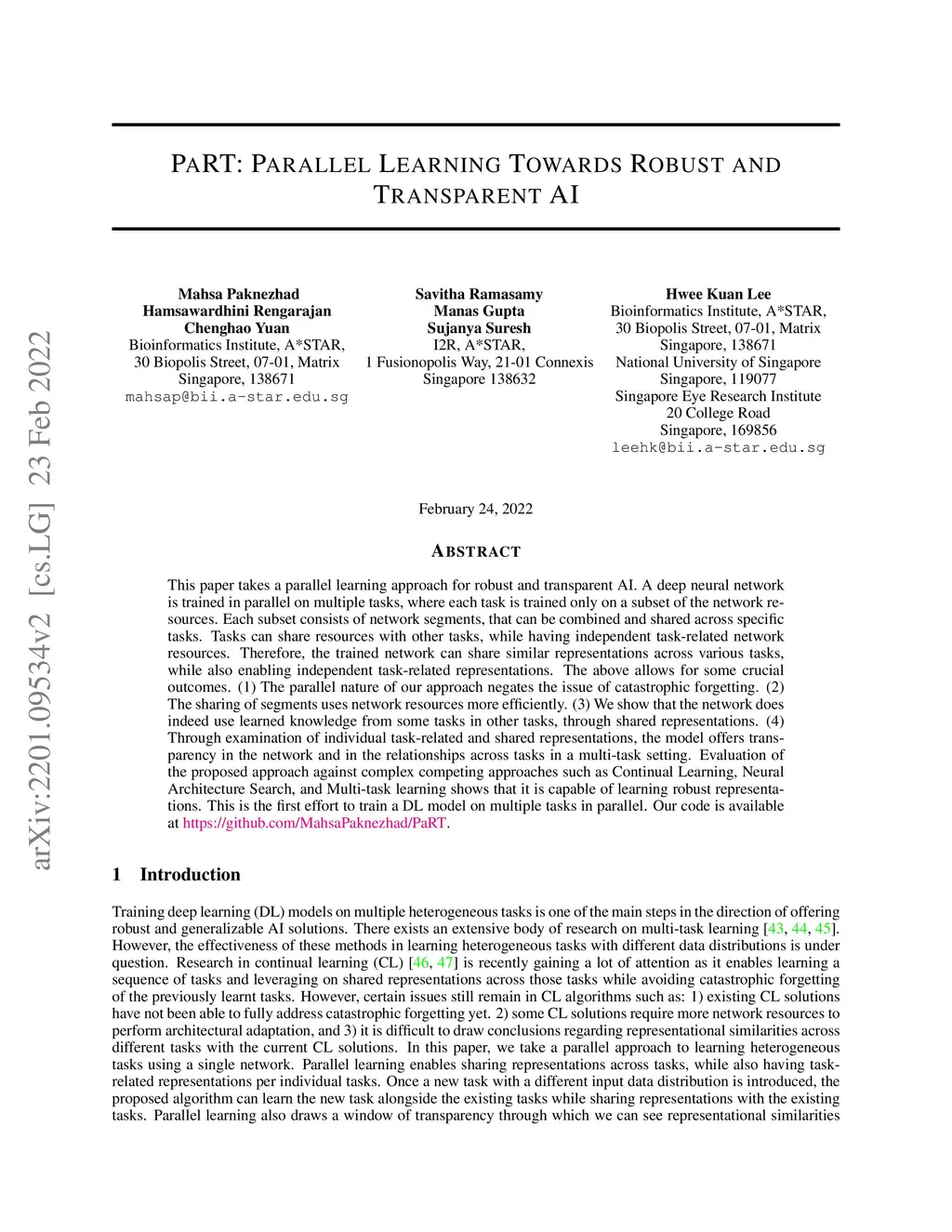 This paper takes a parallel learning approach for robust and transparent AI. A deep neural network is trained in parallel on multiple tasks, where each task is trained only on a subset of the network resources. Each subset consists of network segments, that can be combined and shared across specific tasks. Tasks can share resources with other tasks, while having independent task-related network resources. Therefore, the trained network can share similar representations across various tasks, while also enabling independent task-related representations. The above allows for some crucial outcomes. (1) The parallel nature of our approach negates the issue of catastrophic forgetting. (2) The sharing of segments uses network resources more efficiently. (3) We show that the network does indeed use learned knowledge from some tasks in other tasks, through shared representations. (4) Through examination of individual task-related and shared representations, the model offers transparency in the network and in the relationships across tasks in a multi-task setting. Evaluation of the proposed approach against complex competing approaches such as Continual Learning, Neural Architecture Search, and Multi-task learning shows that it is capable of learning robust representations. This is the first effort to train a DL model on multiple tasks in parallel. Our code is available at https://github.com/MahsaPaknezhad/PaRT