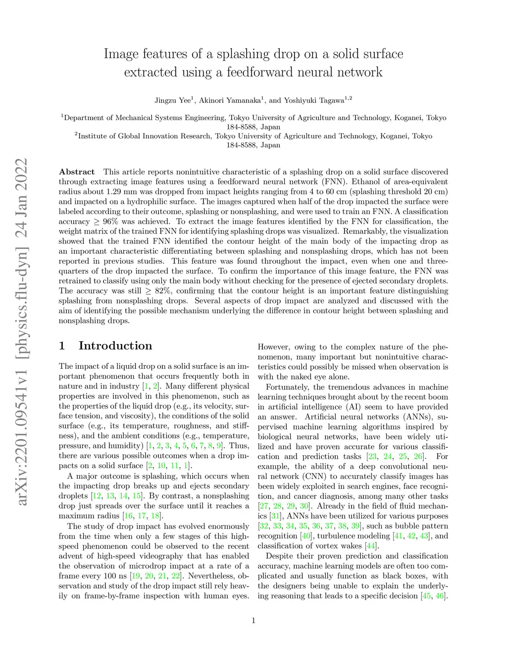 This article reports nonintuitive characteristic of a splashing drop on a solid surface discovered through extracting image features using a feedforward neural network (FNN). Ethanol of area-equivalent radius about 1.29 mm was dropped from impact heights ranging from 4 cm to 60 cm (splashing threshold 20 cm) and impacted on a hydrophilic surface. The images captured when half of the drop impacted the surface were labeled according to their outcome, splashing or nonsplashing, and were used to train an FNN. A classification accuracy higher than 96% was achieved. To extract the image features identified by the FNN for classification, the weight matrix of the trained FNN for identifying splashing drops was visualized. Remarkably, the visualization showed that the trained FNN identified the contour height of the main body of the impacting drop as an important characteristic differentiating between splashing and nonsplashing drops, which has not been reported in previous studies. This feature was found throughout the impact, even when one and three-quarters of the drop impacted the surface. To confirm the importance of this image feature, the FNN was retrained to classify using only the main body without checking for the presence of ejected secondary droplets. The accuracy was still higher than 82%, confirming that the contour height is an important feature distinguishing splashing from nonsplashing drops. Several aspects of drop impact are analyzed and discussed with the aim of identifying the possible mechanism underlying the difference in contour height between splashing and nonsplashing drops.