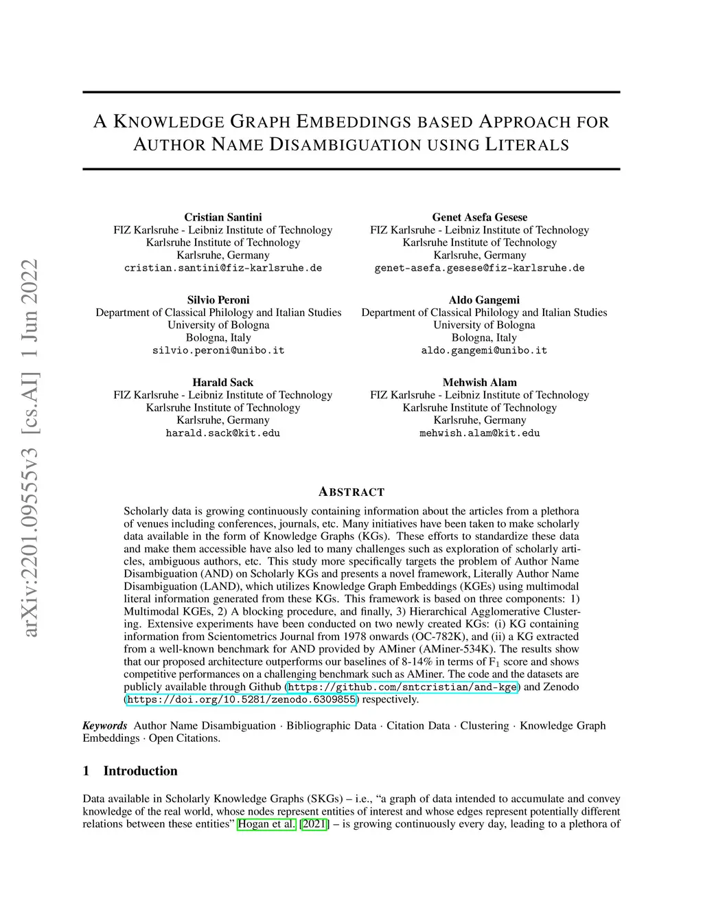 Scholarly data is growing continuously containing information about the articles from a plethora of venues including conferences, journals, etc. Many initiatives have been taken to make scholarly data available as Knowledge Graphs (KGs). These efforts to standardize these data and make them accessible have also led to many challenges such as exploration of scholarly articles, ambiguous authors, etc. This study more specifically targets the problem of Author Name Disambiguation (AND) on Scholarly KGs and presents a novel framework, Literally Author Name Disambiguation (LAND), which utilizes Knowledge Graph Embeddings (KGEs) using multimodal literal information generated from these KGs. This framework is based on three components: 1) Multimodal KGEs, 2) A blocking procedure, and finally, 3) Hierarchical Agglomerative Clustering. Extensive experiments have been conducted on two newly created KGs: (i) KG containing information from Scientometrics Journal from 1978 onwards (OC-782K), and (ii) a KG extracted from a well-known benchmark for AND provided by AMiner (AMiner-534K). The results show that our proposed architecture outperforms our baselines of 8-14% in terms of the F1 score and shows competitive performances on a challenging benchmark such as AMiner. The code and the datasets are publicly available through Github: https://github.com/sntcristian/and-kge and Zenodo:https://doi.org/10.5281/zenodo.6309855 respectively.