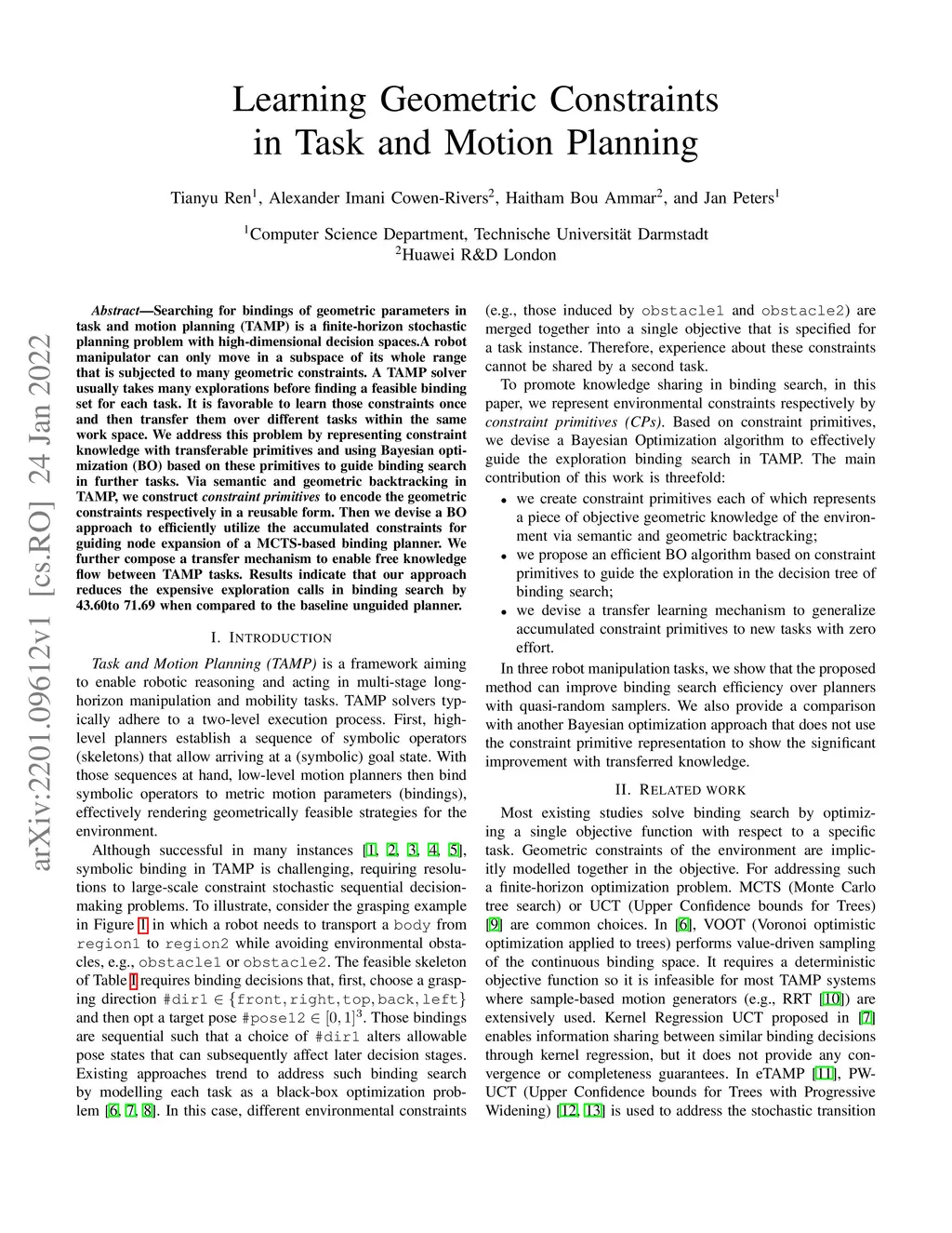 Searching for bindings of geometric parameters in task and motion planning (TAMP) is a finite-horizon stochastic planning problem with high-dimensional decision spaces. A robot manipulator can only move in a subspace of its whole range that is subjected to many geometric constraints. A TAMP solver usually takes many explorations before finding a feasible binding set for each task. It is favorable to learn those constraints once and then transfer them over different tasks within the same workspace. We address this problem by representing constraint knowledge with transferable primitives and using Bayesian optimization (BO) based on these primitives to guide binding search in further tasks. Via semantic and geometric backtracking in TAMP, we construct constraint primitives to encode the geometric constraints respectively in a reusable form. Then we devise a BO approach to efficiently utilize the accumulated constraints for guiding node expansion of an MCTS-based binding planner. We further compose a transfer mechanism to enable free knowledge flow between TAMP tasks. Results indicate that our approach reduces the expensive exploration calls in binding search by 43.60to 71.69 when compared to the baseline unguided planner.