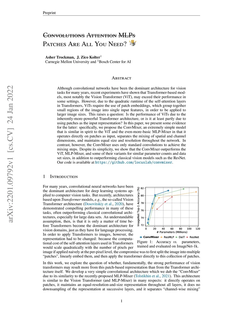 Although convolutional networks have been the dominant architecture for vision tasks for many years, recent experiments have shown that Transformer-based models, most notably the Vision Transformer (ViT), may exceed their performance in some settings. However, due to the quadratic runtime of the self-attention layers in Transformers, ViTs require the use of patch embeddings, which group together small regions of the image into single input features, in order to be applied to larger image sizes. This raises a question: Is the performance of ViTs due to the inherently-more-powerful Transformer architecture, or is it at least partly due to using patches as the input representation? In this paper, we present some evidence for the latter: specifically, we propose the ConvMixer, an extremely simple model that is similar in spirit to the ViT and the even-more-basic MLP-Mixer in that it operates directly on patches as input, separates the mixing of spatial and channel dimensions, and maintains equal size and resolution throughout the network. In contrast, however, the ConvMixer uses only standard convolutions to achieve the mixing steps. Despite its simplicity, we show that the ConvMixer outperforms the ViT, MLP-Mixer, and some of their variants for similar parameter counts and data set sizes, in addition to outperforming classical vision models such as the ResNet. Our code is available at https://github.com/locuslab/convmixer.
