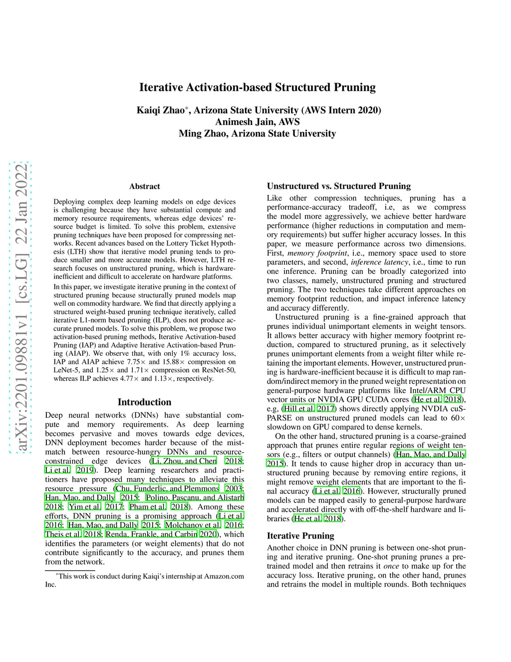 Deploying complex deep learning models on edge devices is challenging because they have substantial compute and memory resource requirements, whereas edge devices' resource budget is limited. To solve this problem, extensive pruning techniques have been proposed for compressing networks. Recent advances based on the Lottery Ticket Hypothesis (LTH) show that iterative model pruning tends to produce smaller and more accurate models. However, LTH research focuses on unstructured pruning, which is hardware-inefficient and difficult to accelerate on hardware platforms. In this paper, we investigate iterative pruning in the context of structured pruning because structurally pruned models map well on commodity hardware. We find that directly applying a structured weight-based pruning technique iteratively, called iterative L1-norm based pruning (ILP), does not produce accurate pruned models. To solve this problem, we propose two activation-based pruning methods, Iterative Activation-based Pruning (IAP) and Adaptive Iterative Activation-based Pruning (AIAP). We observe that, with only 1% accuracy loss, IAP and AIAP achieve 7.75X and 15.88$X compression on LeNet-5, and 1.25X and 1.71X compression on ResNet-50, whereas ILP achieves 4.77X and 1.13X, respectively.