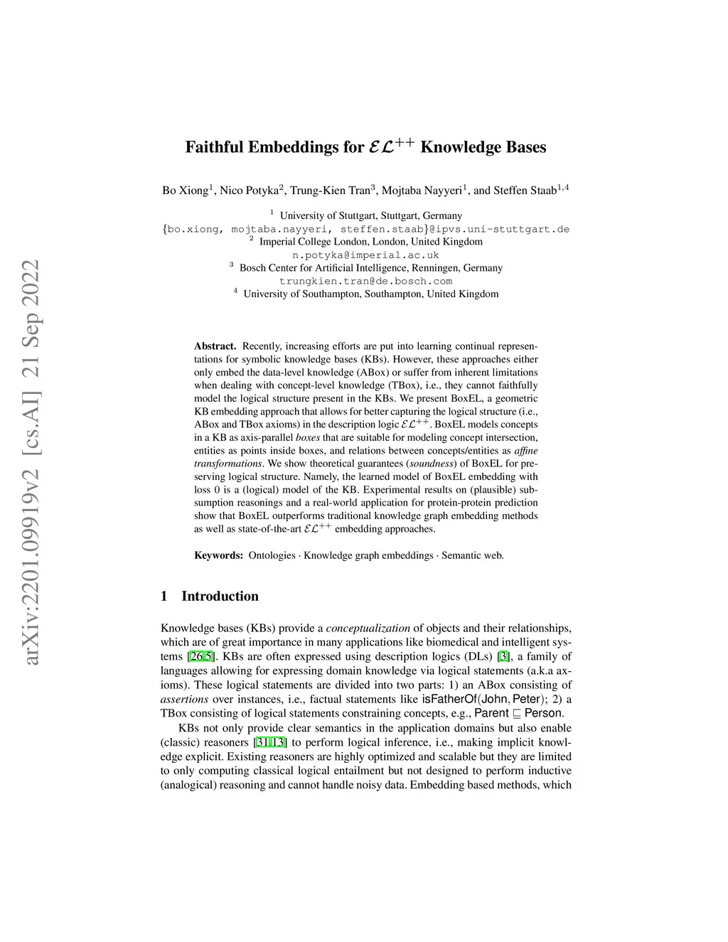 Recently, increasing efforts are put into learning continual representations for symbolic knowledge bases (KBs). However, these approaches either only embed the data-level knowledge (ABox) or suffer from inherent limitations when dealing with concept-level knowledge (TBox), i.e., they cannot faithfully model the logical structure present in the KBs. We present BoxEL, a geometric KB embedding approach that allows for better capturing the logical structure (i.e., ABox and TBox axioms) in the description logic EL++. BoxEL models concepts in a KB as axis-parallel boxes that are suitable for modeling concept intersection, entities as points inside boxes, and relations between concepts/entities as affine transformations. We show theoretical guarantees (soundness) of BoxEL for preserving logical structure. Namely, the learned model of BoxEL embedding with loss 0 is a (logical) model of the KB. Experimental results on (plausible) subsumption reasonings and a real-world application for protein-protein prediction show that BoxEL outperforms traditional knowledge graph embedding methods as well as state-of-the-art EL++ embedding approaches.
