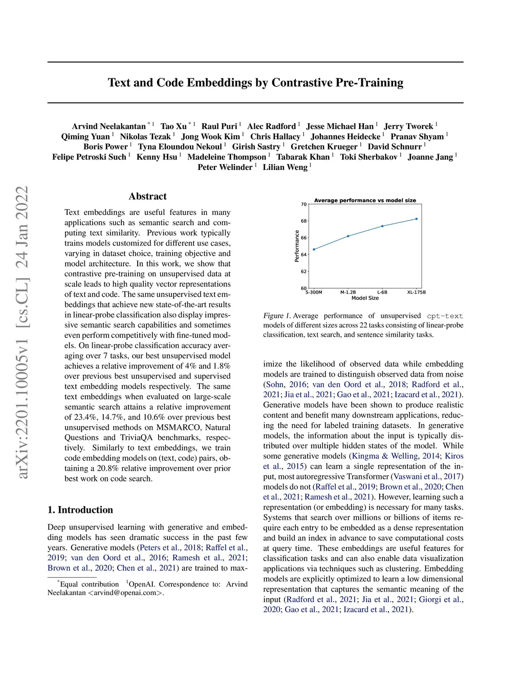 Text embeddings are useful features in many applications such as semantic search and computing text similarity. Previous work typically trains models customized for different use cases, varying in dataset choice, training objective and model architecture. In this work, we show that contrastive pre-training on unsupervised data at scale leads to high quality vector representations of text and code. The same unsupervised text embeddings that achieve new state-of-the-art results in linear-probe classification also display impressive semantic search capabilities and sometimes even perform competitively with fine-tuned models. On linear-probe classification accuracy averaging over 7 tasks, our best unsupervised model achieves a relative improvement of 4% and 1.8% over previous best unsupervised and supervised text embedding models respectively. The same text embeddings when evaluated on large-scale semantic search attains a relative improvement of 23.4%, 14.7%, and 10.6% over previous best unsupervised methods on MSMARCO, Natural Questions and TriviaQA benchmarks, respectively. Similarly to text embeddings, we train code embedding models on (text, code) pairs, obtaining a 20.8% relative improvement over prior best work on code search.