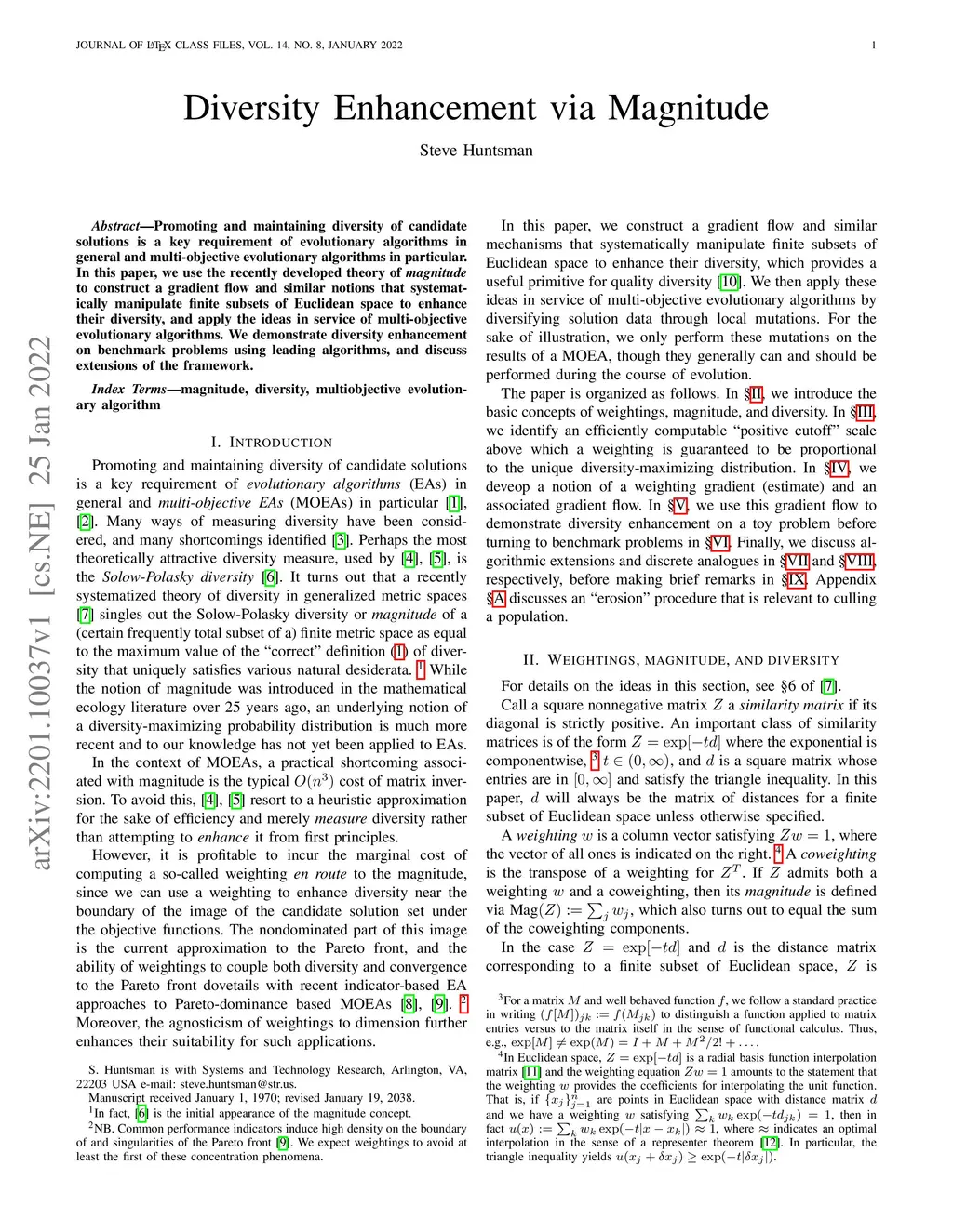 Promoting and maintaining diversity of candidate solutions is a key requirement of evolutionary algorithms in general and multi-objective evolutionary algorithms in particular. In this paper, we use the recently developed theory of magnitude to construct a gradient flow and similar notions that systematically manipulate finite subsets of Euclidean space to enhance their diversity, and apply the ideas in service of multi-objective evolutionary algorithms. We demonstrate diversity enhancement on benchmark problems using leading algorithms, and discuss extensions of the framework.