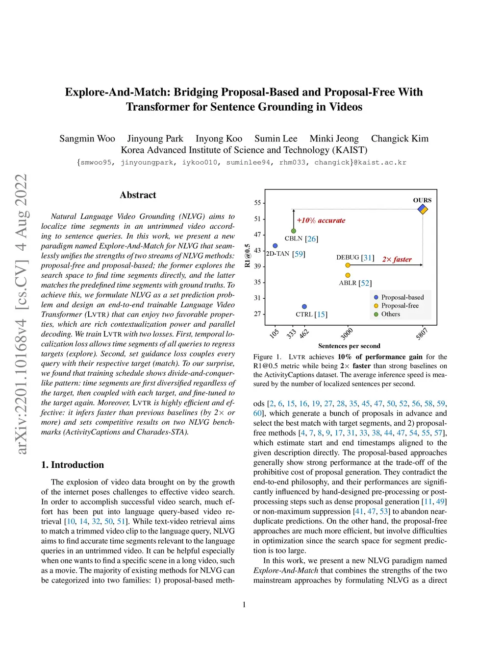 Natural Language Video Grounding (NLVG) aims to localize time segments in an untrimmed video according to sentence queries. In this work, we present a new paradigm named Explore-And-Match for NLVG that seamlessly unifies the strengths of two streams of NLVG methods: proposal-free and proposal-based; the former explores the search space to find time segments directly, and the latter matches the predefined time segments with ground truths. To achieve this, we formulate NLVG as a set prediction problem and design an end-to-end trainable Language Video Transformer (LVTR) that can enjoy two favorable properties, which are rich contextualization power and parallel decoding. We train LVTR with two losses. First, temporal localization loss allows time segments of all queries to regress targets (explore). Second, set guidance loss couples every query with their respective target (match). To our surprise, we found that training schedule shows divide-and-conquer-like pattern: time segments are first diversified regardless of the target, then coupled with each target, and fine-tuned to the target again. Moreover, LVTR is highly efficient and effective: it infers faster than previous baselines (by 2X or more) and sets competitive results on two NLVG benchmarks (ActivityCaptions and Charades-STA). Codes are available at https://github.com/sangminwoo/Explore-And-Match.