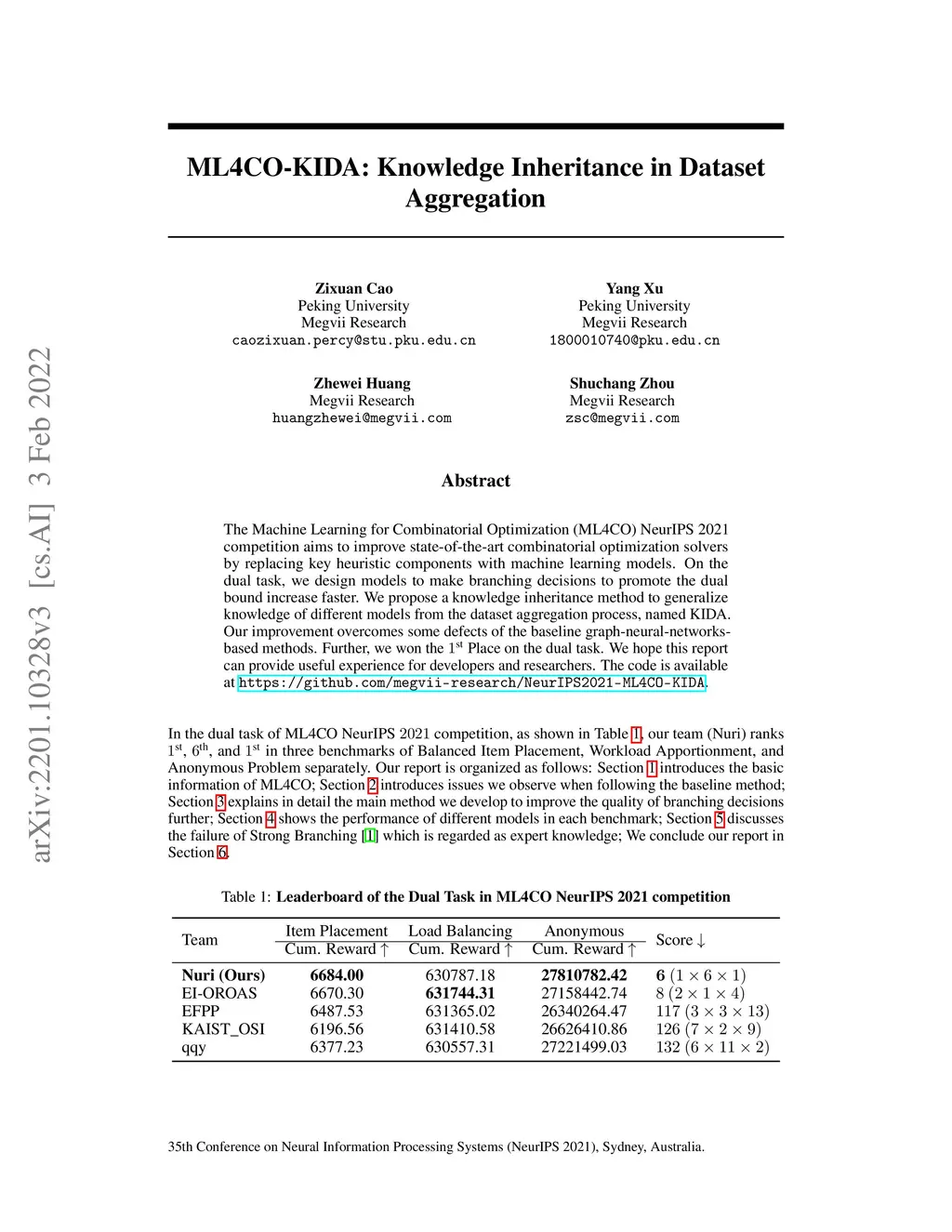 The Machine Learning for Combinatorial Optimization (ML4CO) NeurIPS 2021 competition aims to improve state-of-the-art combinatorial optimization solvers by replacing key heuristic components with machine learning models. On the dual task, we design models to make branching decisions to promote the dual bound increase faster. We propose a knowledge inheritance method to generalize knowledge of different models from the dataset aggregation process, named KIDA. Our improvement overcomes some defects of the baseline graph-neural-networks-based methods. Further, we won the \textsuperscript{st} Place on the dual task. We hope this report can provide useful experience for developers and researchers. The code is available at https://github.com/megvii-research/NeurIPS2021-ML4CO-KIDA.