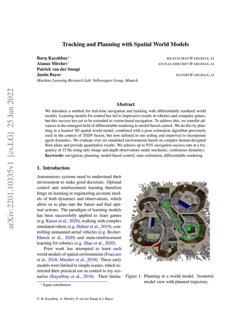 We introduce a method for real-time navigation and tracking with differentiably rendered world models. Learning models for control has led to impressive results in robotics and computer games, but this success has yet to be extended to vision-based navigation. To address this, we transfer advances in the emergent field of differentiable rendering to model-based control. We do this by planning in a learned 3D spatial world model, combined with a pose estimation algorithm previously used in the context of TSDF fusion, but now tailored to our setting and improved to incorporate agent dynamics. We evaluate over six simulated environments based on complex human-designed floor plans and provide quantitative results. We achieve up to 92% navigation success rate at a frequency of 15 Hz using only image and depth observations under stochastic, continuous dynamics.