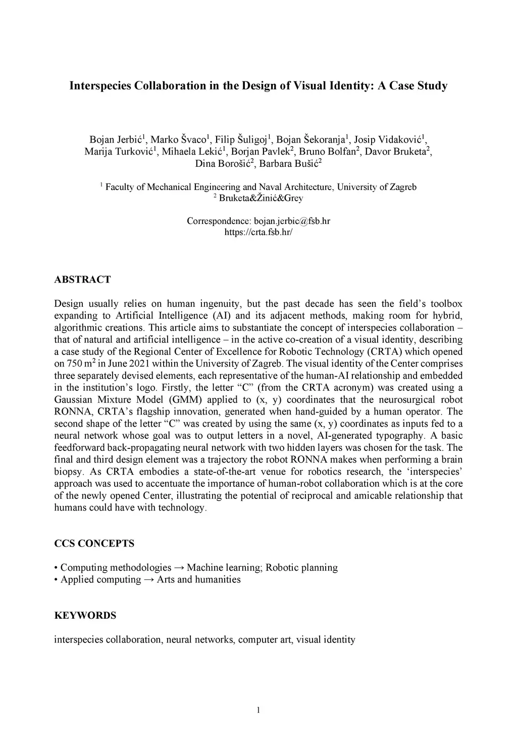 Design usually relies on human ingenuity, but the past decade has seen the field's toolbox expanding to Artificial Intelligence (AI) and its adjacent methods, making room for hybrid, algorithmic creations. This article aims to substantiate the concept of interspecies collaboration - that of natural and artificial intelligence - in the active co-creation of a visual identity, describing a case study of the Regional Center of Excellence for Robotic Technology (CRTA) which opened on 750 m2 in June 2021 within the University of Zagreb. The visual identity of the Center comprises three separately devised elements, each representative of the human-AI relationship and embedded in the institution's logo. Firstly, the letter "C" (from the CRTA acronym) was created using a Gaussian Mixture Model (GMM) applied to (x, y) coordinates that the neurosurgical robot RONNA, CRTA's flagship innovation, generated when hand-guided by a human operator. The second shape of the letter "C" was created by using the same (x, y) coordinates as inputs fed to a neural network whose goal was to output letters in a novel, AI-generated typography. A basic feedforward back-propagating neural network with two hidden layers was chosen for the task. The final and third design element was a trajectory the robot RONNA makes when performing a brain biopsy. As CRTA embodies a state-of-the-art venue for robotics research, the ínterspecies' approach was used to accentuate the importance of human-robot collaboration which is at the core of the newly opened Center, illustrating the potential of reciprocal and amicable relationship that humans could have with technology.