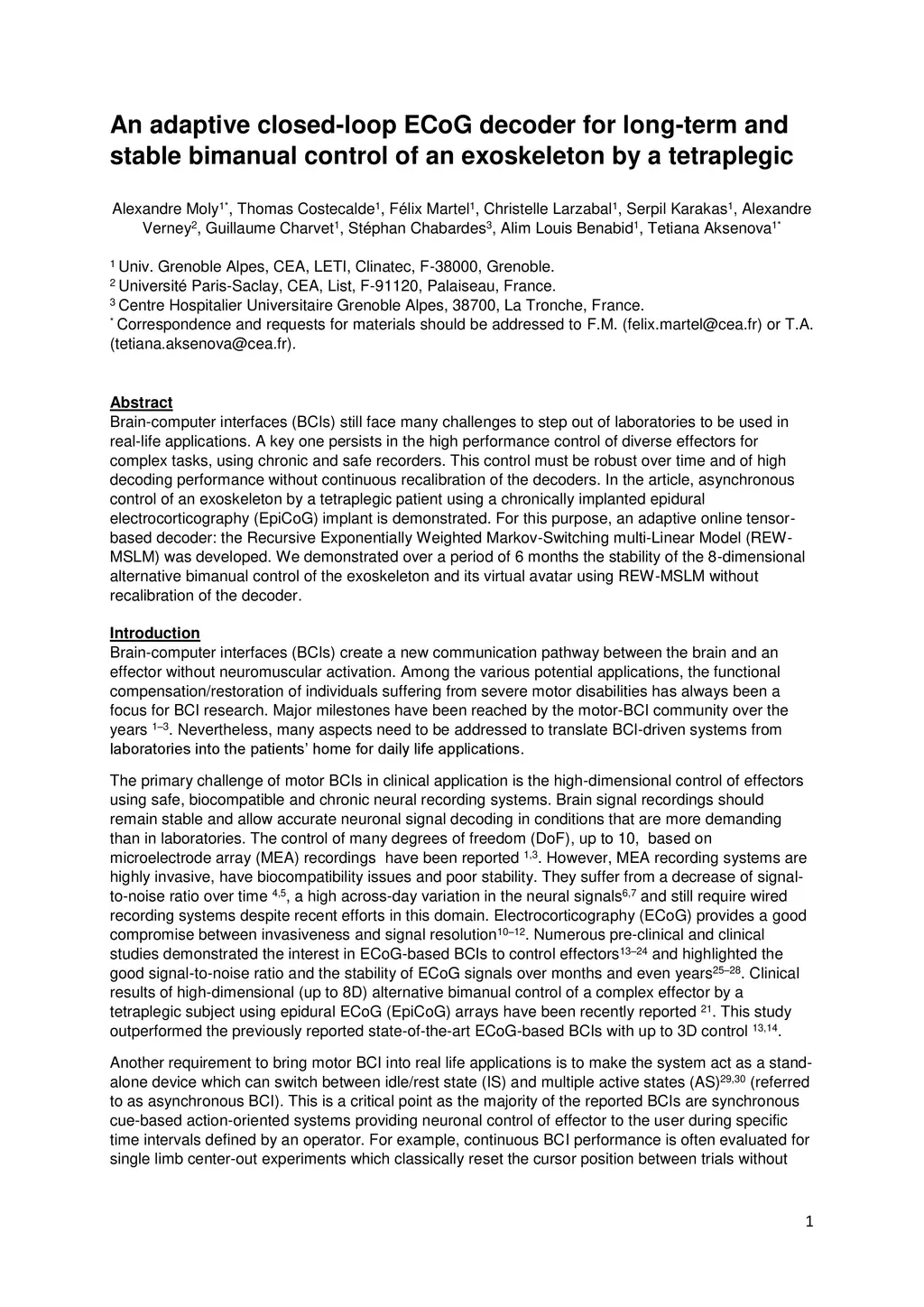 Brain-computer interfaces (BCIs) still face many challenges to step out of laboratories to be used in real-life applications. A key one persists in the high performance control of diverse effectors for complex tasks, using chronic and safe recorders. This control must be robust over time and of high decoding performance without continuous recalibration of the decoders. In the article, asynchronous control of an exoskeleton by a tetraplegic patient using a chronically implanted epidural electrocorticography (EpiCoG) implant is demonstrated. For this purpose, an adaptive online tensor-based decoder: the Recursive Exponentially Weighted Markov-Switching multi-Linear Model (REW-MSLM) was developed. We demonstrated over a period of 6 months the stability of the 8-dimensional alternative bimanual control of the exoskeleton and its virtual avatar using REW-MSLM without recalibration of the decoder.