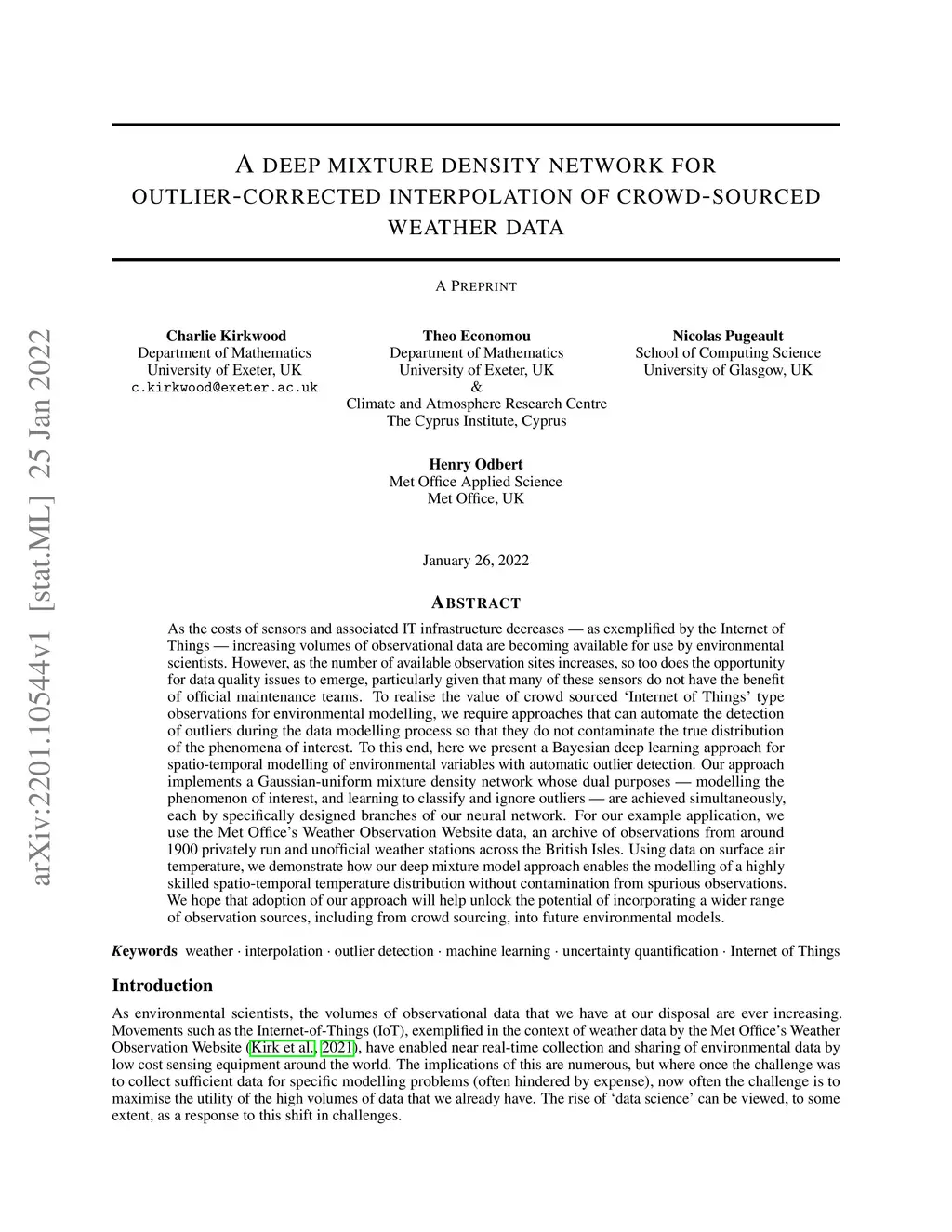 As the costs of sensors and associated IT infrastructure decreases - as exemplified by the Internet of Things - increasing volumes of observational data are becoming available for use by environmental scientists. However, as the number of available observation sites increases, so too does the opportunity for data quality issues to emerge, particularly given that many of these sensors do not have the benefit of official maintenance teams. To realise the value of crowd sourced Ínternet of Things' type observations for environmental modelling, we require approaches that can automate the detection of outliers during the data modelling process so that they do not contaminate the true distribution of the phenomena of interest. To this end, here we present a Bayesian deep learning approach for spatio-temporal modelling of environmental variables with automatic outlier detection. Our approach implements a Gaussian-uniform mixture density network whose dual purposes - modelling the phenomenon of interest, and learning to classify and ignore outliers - are achieved simultaneously, each by specifically designed branches of our neural network. For our example application, we use the Met Office's Weather Observation Website data, an archive of observations from around 1900 privately run and unofficial weather stations across the British Isles. Using data on surface air temperature, we demonstrate how our deep mixture model approach enables the modelling of a highly skilled spatio-temporal temperature distribution without contamination from spurious observations. We hope that adoption of our approach will help unlock the potential of incorporating a wider range of observation sources, including from crowd sourcing, into future environmental models.