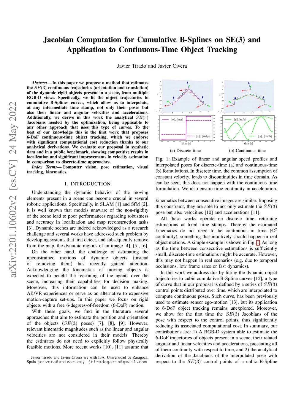 In this paper we propose a method that estimates the continuous trajectories (orientation and translation) of the dynamic rigid objects present in a scene, from multiple RGB-D views. Specifically, we fit the object trajectories to cumulative B-Splines curves, which allow us to interpolate, at any intermediate time stamp, not only their poses but also their linear and angular velocities and accelerations. Additionally, we derive in this work the analytical Jacobians needed by the optimization, being applicable to any other approach that uses this type of curves. To the best of our knowledge this is the first work that proposes 6-DoF continuous-time object tracking, which we endorse with significant computational cost reduction thanks to our analytical derivations. We evaluate our proposal in synthetic data and in a public benchmark, showing competitive results in localization and significant improvements in velocity estimation in comparison to discrete-time approaches.