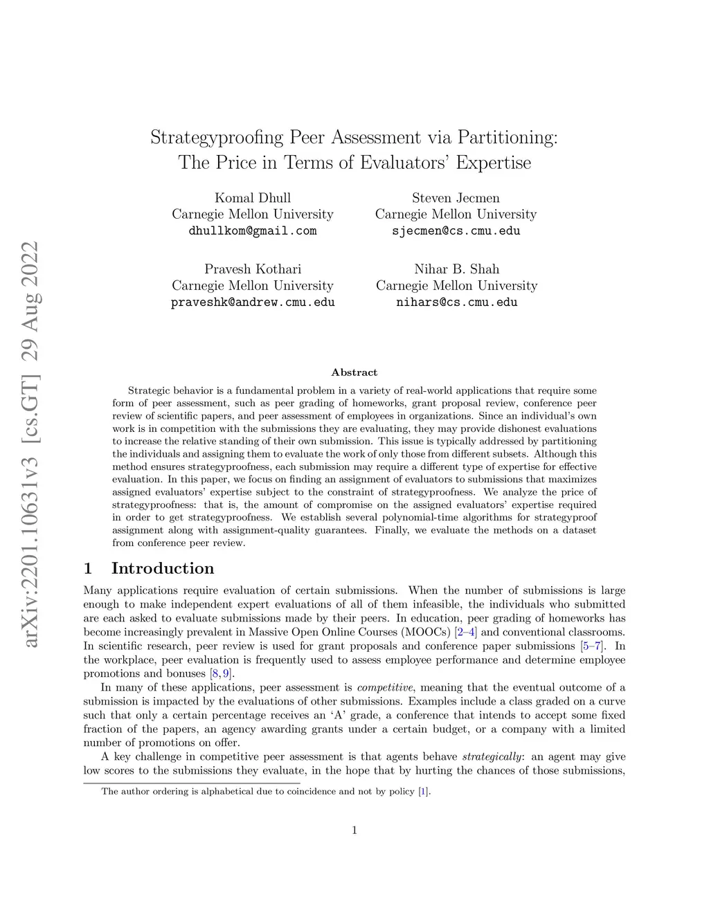Strategic behavior is a fundamental problem in a variety of real-world applications that require some form of peer assessment, such as peer grading of homeworks, grant proposal review, conference peer review of scientific papers, and peer assessment of employees in organizations. Since an individual's own work is in competition with the submissions they are evaluating, they may provide dishonest evaluations to increase the relative standing of their own submission. This issue is typically addressed by partitioning the individuals and assigning them to evaluate the work of only those from different subsets. Although this method ensures strategyproofness, each submission may require a different type of expertise for effective evaluation. In this paper, we focus on finding an assignment of evaluators to submissions that maximizes assigned evaluators' expertise subject to the constraint of strategyproofness. We analyze the price of strategyproofness: that is, the amount of compromise on the assigned evaluators' expertise required in order to get strategyproofness. We establish several polynomial-time algorithms for strategyproof assignment along with assignment-quality guarantees. Finally, we evaluate the methods on a dataset from conference peer review.