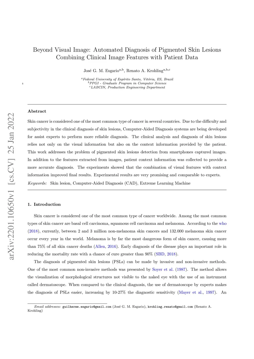 kin cancer is considered one of the most common type of cancer in several countries. Due to the difficulty and subjectivity in the clinical diagnosis of skin lesions, Computer-Aided Diagnosis systems are being developed for assist experts to perform more reliable diagnosis. The clinical analysis and diagnosis of skin lesions relies not only on the visual information but also on the context information provided by the patient. This work addresses the problem of pigmented skin lesions detection from smartphones captured images. In addition to the features extracted from images, patient context information was collected to provide a more accurate diagnosis. The experiments showed that the combination of visual features with context information improved final results. Experimental results are very promising and comparable to experts.