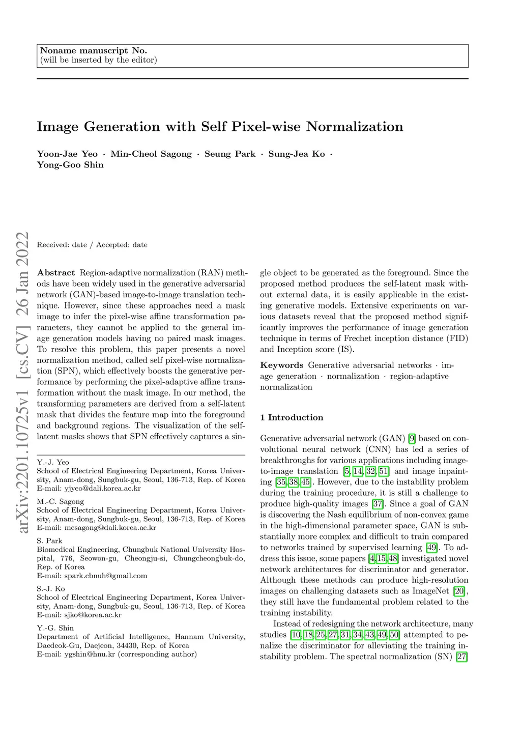 Region-adaptive normalization (RAN) methods have been widely used in the generative adversarial network (GAN)-based image-to-image translation technique. However, since these approaches need a mask image to infer the pixel-wise affine transformation parameters, they cannot be applied to the general image generation models having no paired mask images. To resolve this problem, this paper presents a novel normalization method, called self pixel-wise normalization (SPN), which effectively boosts the generative performance by performing the pixel-adaptive affine transformation without the mask image. In our method, the transforming parameters are derived from a self-latent mask that divides the feature map into the foreground and background regions. The visualization of the self-latent masks shows that SPN effectively captures a single object to be generated as the foreground. Since the proposed method produces the self-latent mask without external data, it is easily applicable in the existing generative models. Extensive experiments on various datasets reveal that the proposed method significantly improves the performance of image generation technique in terms of Frechet inception distance (FID) and Inception score (IS).