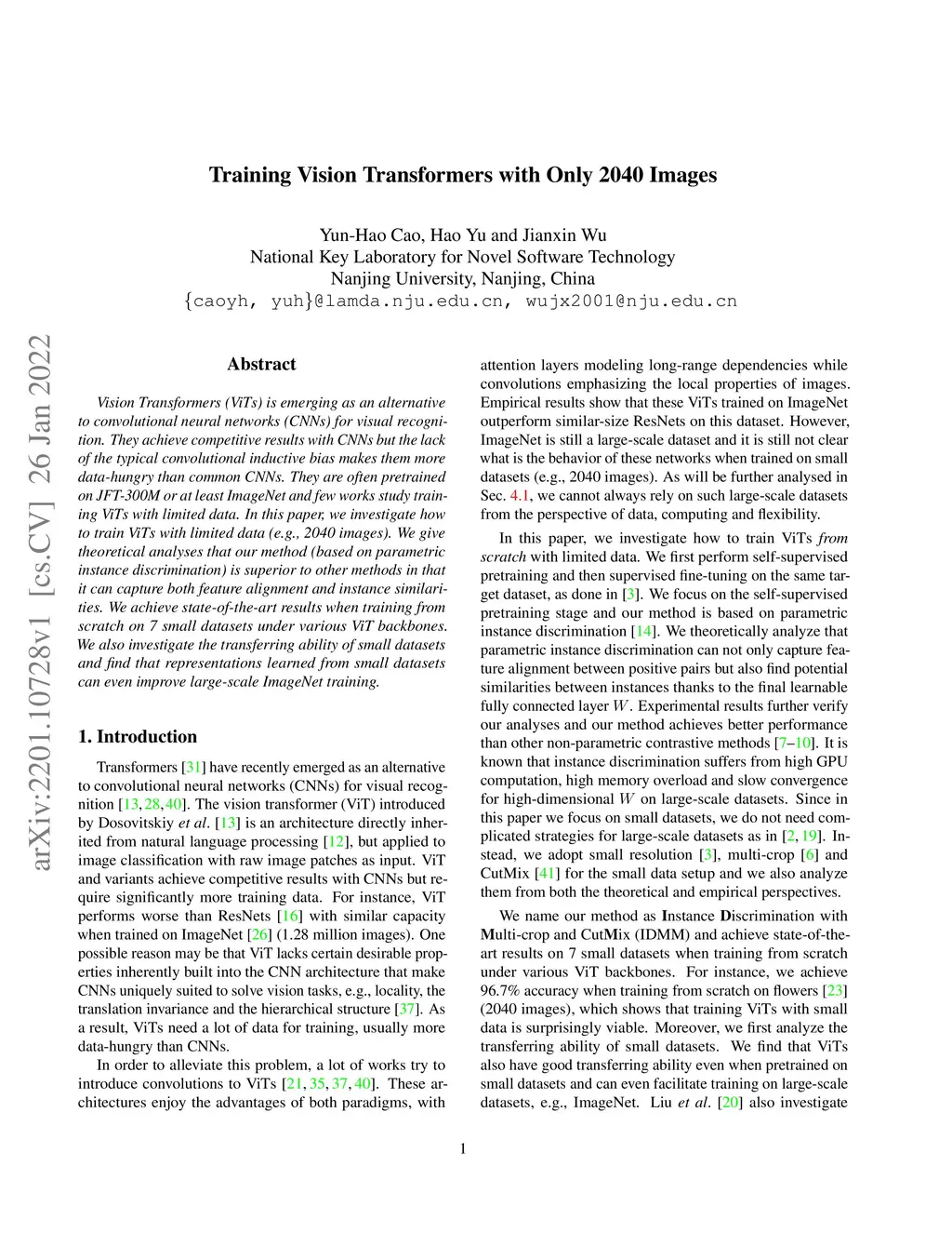 Vision Transformers (ViTs) is emerging as an alternative to convolutional neural networks (CNNs) for visual recognition. They achieve competitive results with CNNs but the lack of the typical convolutional inductive bias makes them more data-hungry than common CNNs. They are often pretrained on JFT-300M or at least ImageNet and few works study training ViTs with limited data. In this paper, we investigate how to train ViTs with limited data (e.g., 2040 images). We give theoretical analyses that our method (based on parametric instance discrimination) is superior to other methods in that it can capture both feature alignment and instance similarities. We achieve state-of-the-art results when training from scratch on 7 small datasets under various ViT backbones. We also investigate the transferring ability of small datasets and find that representations learned from small datasets can even improve large-scale ImageNet training.