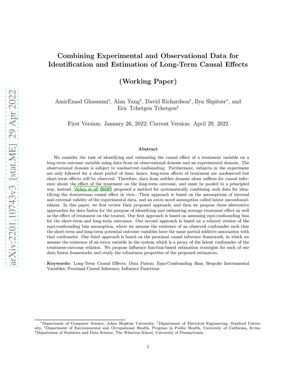 We study identifying and estimating the causal effect of a treatment variable on a long-term outcome using data from an observational and an experimental domain. The observational data are subject to unobserved confounding. Furthermore, subjects in the experiment are only followed for a short period; thus, long-term effects are unobserved, though short-term effects are available. Consequently, neither data source alone suffices for causal inference on the long-term outcome, necessitating a principled fusion of the two. We propose three approaches for data fusion for the purpose of identifying and estimating the causal effect. The first assumes equal confounding bias for short-term and long-term outcomes. The second weakens this assumption by leveraging an observed confounder for which the short-term and long-term potential outcomes share the same partial additive association with this confounder. The third approach employs proxy variables of the latent confounder of the treatment-outcome relationship, extending the proximal causal inference framework to the data fusion setting. For each approach, we develop influence function-based estimators and analyze their robustness properties. We illustrate our methods by estimating the effect of class size on 8th-grade SAT scores using data from the Project STAR experiment combined with observational data from the Early Childhood Longitudinal Study.