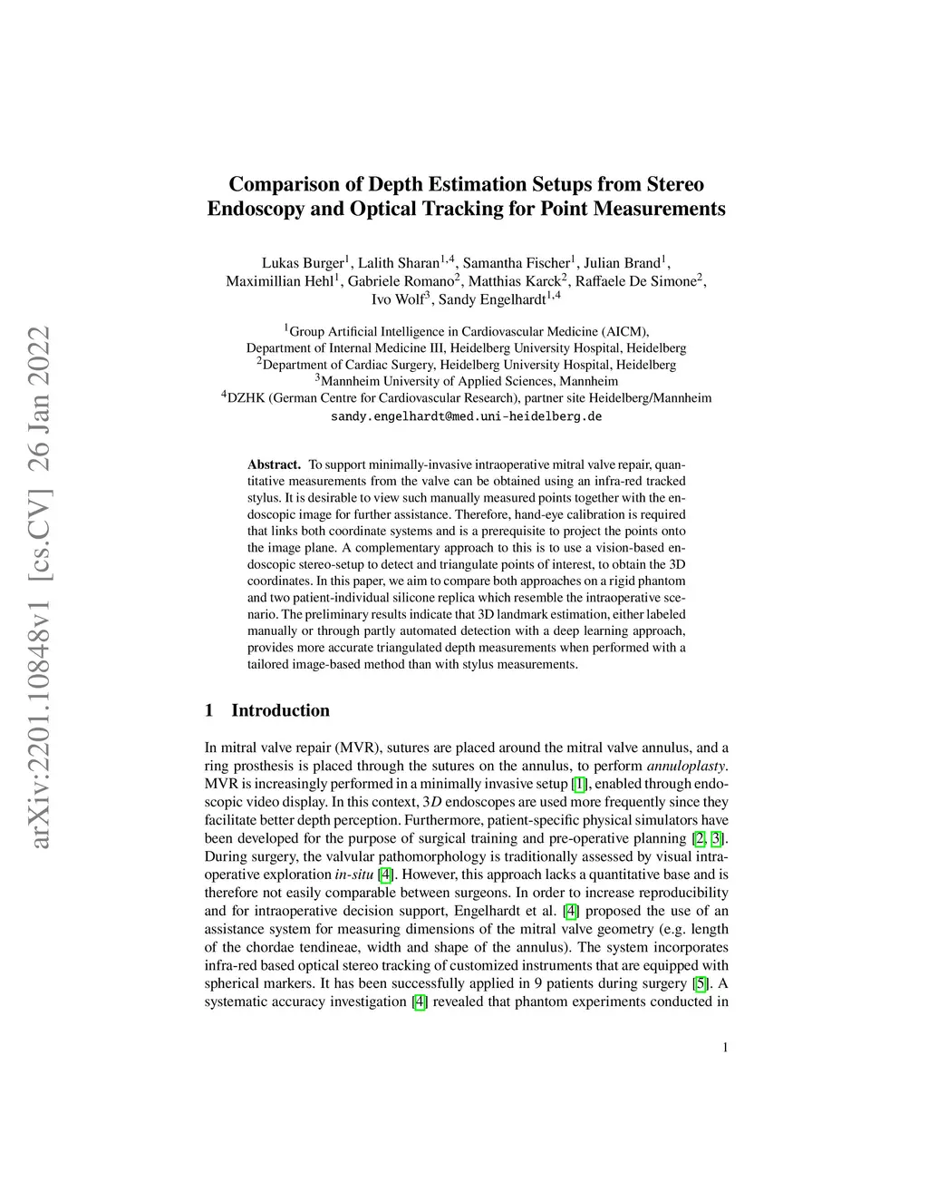 To support minimally-invasive intraoperative mitral valve repair, quantitative measurements from the valve can be obtained using an infra-red tracked stylus. It is desirable to view such manually measured points together with the endoscopic image for further assistance. Therefore, hand-eye calibration is required that links both coordinate systems and is a prerequisite to project the points onto the image plane. A complementary approach to this is to use a vision-based endoscopic stereo-setup to detect and triangulate points of interest, to obtain the 3D coordinates. In this paper, we aim to compare both approaches on a rigid phantom and two patient-individual silicone replica which resemble the intraoperative scenario. The preliminary results indicate that 3D landmark estimation, either labeled manually or through partly automated detection with a deep learning approach, provides more accurate triangulated depth measurements when performed with a tailored image-based method than with stylus measurements.