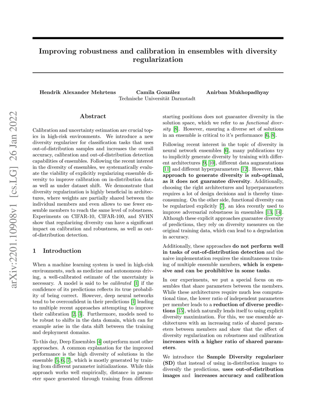 Calibration and uncertainty estimation are crucial topics in high-risk environments. We introduce a new diversity regularizer for classification tasks that uses out-of-distribution samples and increases the overall accuracy, calibration and out-of-distribution detection capabilities of ensembles. Following the recent interest in the diversity of ensembles, we systematically evaluate the viability of explicitly regularizing ensemble diversity to improve calibration on in-distribution data as well as under dataset shift. We demonstrate that diversity regularization is highly beneficial in architectures, where weights are partially shared between the individual members and even allows to use fewer ensemble members to reach the same level of robustness. Experiments on CIFAR-10, CIFAR-100, and SVHN show that regularizing diversity can have a significant impact on calibration and robustness, as well as out-of-distribution detection.