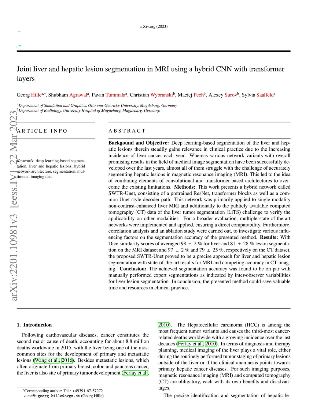Deep learning-based segmentation of the liver and hepatic lesions therein steadily gains relevance in clinical practice due to the increasing incidence of liver cancer each year. Whereas various network variants with overall promising results in the field of medical image segmentation have been successfully developed over the last years, almost all of them struggle with the challenge of accurately segmenting hepatic lesions in magnetic resonance imaging (MRI). This led to the idea of combining elements of convolutional and transformer-based architectures to overcome the existing limitations. This work presents a hybrid network called SWTR-Unet, consisting of a pretrained ResNet, transformer blocks as well as a common Unet-style decoder path. This network was primarily applied to single-modality non-contrast-enhanced liver MRI and additionally to the publicly available computed tomography (CT) data of the liver tumor segmentation (LiTS) challenge to verify the applicability on other modalities. For a broader evaluation, multiple state-of-the-art networks were implemented and applied, ensuring a direct comparability. Furthermore, correlation analysis and an ablation study were carried out, to investigate various influencing factors on the segmentation accuracy of the presented method. With Dice scores of averaged 98+-2% for liver and 81+-28% lesion segmentation on the MRI dataset and 97+-2% and 79+-25%, respectively on the CT dataset, the proposed SWTR-Unet proved to be a precise approach for liver and hepatic lesion segmentation with state-of-the-art results for MRI and competing accuracy in CT imaging. The achieved segmentation accuracy was found to be on par with manually performed expert segmentations as indicated by inter-observer variabilities for liver lesion segmentation. In conclusion, the presented method could save valuable time and resources in clinical practice.