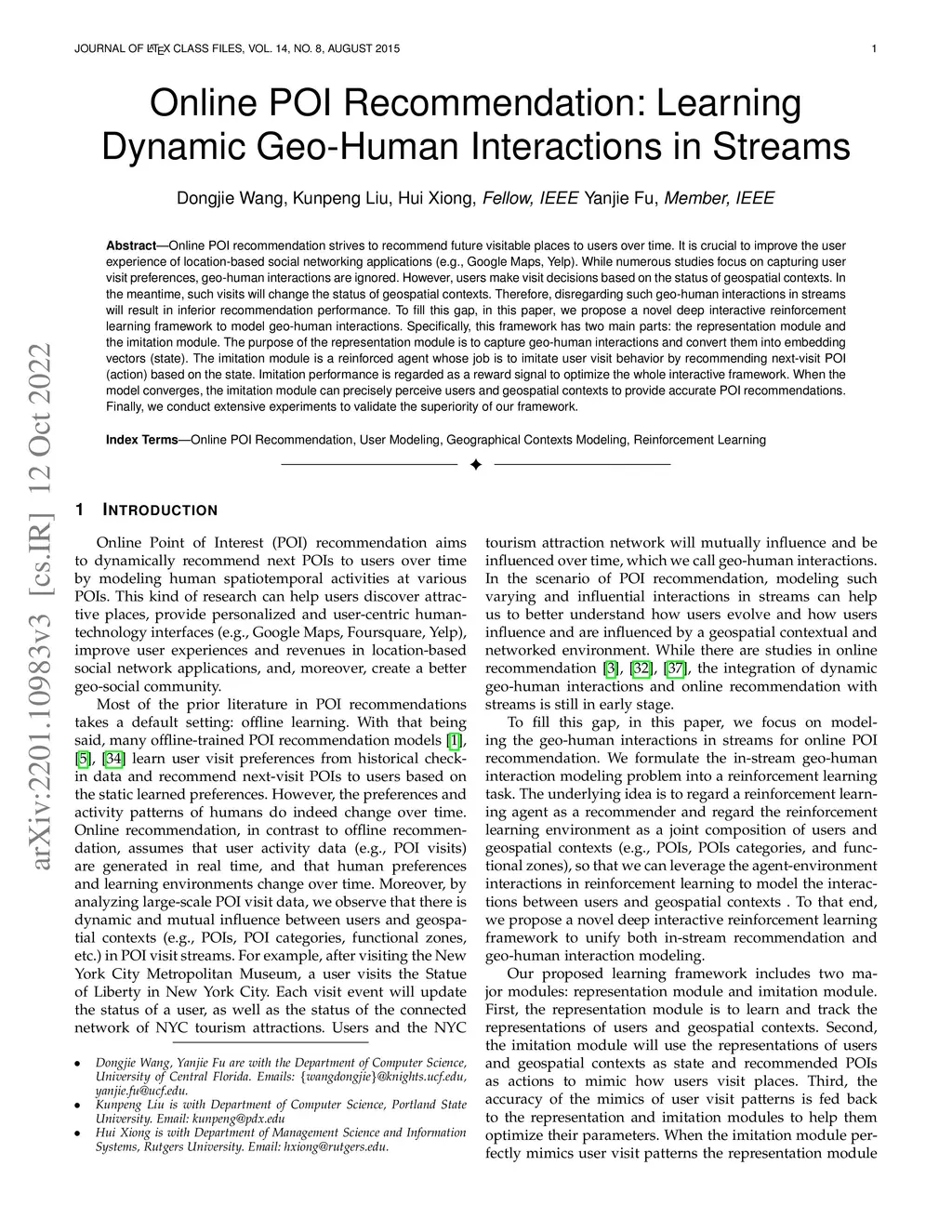 In this paper, we focus on the problem of modeling dynamic geo-human interactions in streams for online POI recommendations. Specifically, we formulate the in-stream geo-human interaction modeling problem into a novel deep interactive reinforcement learning framework, where an agent is a recommender and an action is a next POI to visit. We uniquely model the reinforcement learning environment as a joint and connected composition of users and geospatial contexts (POIs, POI categories, functional zones). An event that a user visits a POI in stream updates the states of both users and geospatial contexts; the agent perceives the updated environment state to make online recommendations. Specifically, we model a mixed-user event stream by unifying all users, visits, and geospatial contexts as a dynamic knowledge graph stream, in order to model human-human, geo-human, geo-geo interactions. We design an exit mechanism to address the expired information challenge, devise a meta-path method to address the recommendation candidate generation challenge, and develop a new deep policy network structure to address the varying action space challenge, and, finally, propose an effective adversarial training method for optimization. Finally, we present extensive experiments to demonstrate the enhanced performance of our method.