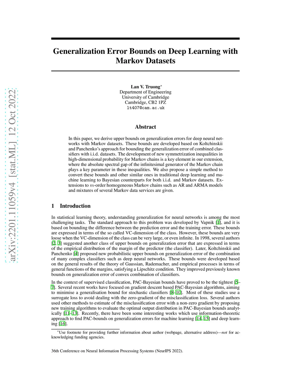 In this paper, we derive upper bounds on generalization errors for deep neural networks with Markov datasets. These bounds are developed based on Koltchinskii and Panchenko's approach for bounding the generalization error of combined classifiers with i.i.d. datasets. The development of new symmetrization inequalities in high-dimensional probability for Markov chains is a key element in our extension, where the spectral gap of the infinitesimal generator of the Markov chain plays a key parameter in these inequalities. We also propose a simple method to convert these bounds and other similar ones in traditional deep learning and machine learning to Bayesian counterparts for both i.i.d. and Markov datasets. Extensions to -order homogeneous Markov chains such as AR and ARMA models and mixtures of several Markov data services are given.