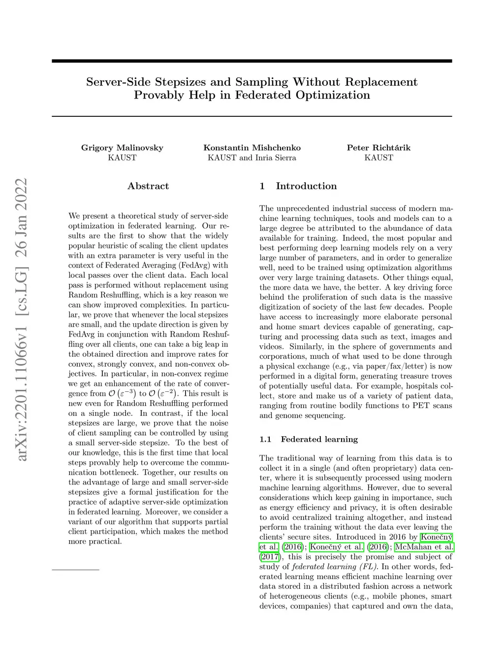We present a theoretical study of server-side optimization in federated learning. Our results are the first to show that the widely popular heuristic of scaling the client updates with an extra parameter is very useful in the context of Federated Averaging (FedAvg) with local passes over the client data. Each local pass is performed without replacement using Random Reshuffling, which is a key reason we can show improved complexities. In particular, we prove that whenever the local stepsizes are small, and the update direction is given by FedAvg in conjunction with Random Reshuffling over all clients, one can take a big leap in the obtained direction and improve rates for convex, strongly convex, and non-convex objectives. In particular, in non-convex regime we get an enhancement of the rate of convergence from to . This result is new even for Random Reshuffling performed on a single node. In contrast, if the local stepsizes are large, we prove that the noise of client sampling can be controlled by using a small server-side stepsize. To the best of our knowledge, this is the first time that local steps provably help to overcome the communication bottleneck. Together, our results on the advantage of large and small server-side stepsizes give a formal justification for the practice of adaptive server-side optimization in federated learning. Moreover, we consider a variant of our algorithm that supports partial client participation, which makes the method more practical.