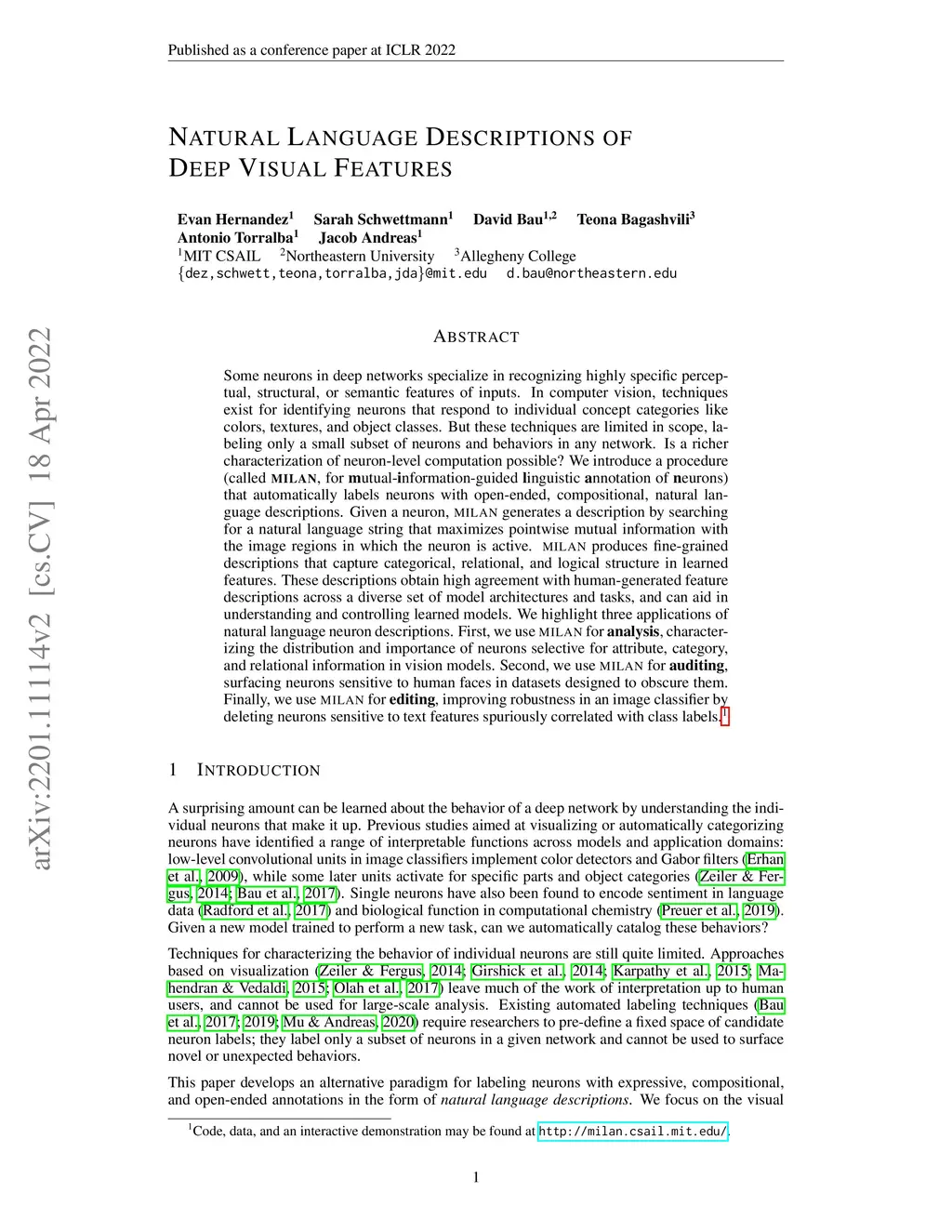 Some neurons in deep networks specialize in recognizing highly specific perceptual, structural, or semantic features of inputs. In computer vision, techniques exist for identifying neurons that respond to individual concept categories like colors, textures, and object classes. But these techniques are limited in scope, labeling only a small subset of neurons and behaviors in any network. Is a richer characterization of neuron-level computation possible? We introduce a procedure (called MILAN, for mutual-information-guided linguistic annotation of neurons) that automatically labels neurons with open-ended, compositional, natural language descriptions. Given a neuron, MILAN generates a description by searching for a natural language string that maximizes pointwise mutual information with the image regions in which the neuron is active. MILAN produces fine-grained descriptions that capture categorical, relational, and logical structure in learned features. These descriptions obtain high agreement with human-generated feature descriptions across a diverse set of model architectures and tasks, and can aid in understanding and controlling learned models. We highlight three applications of natural language neuron descriptions. First, we use MILAN for analysis, characterizing the distribution and importance of neurons selective for attribute, category, and relational information in vision models. Second, we use MILAN for auditing, surfacing neurons sensitive to human faces in datasets designed to obscure them. Finally, we use MILAN for editing, improving robustness in an image classifier by deleting neurons sensitive to text features spuriously correlated with class labels.