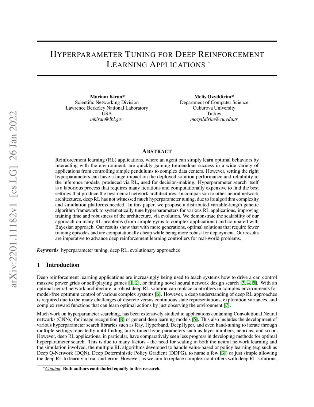 Reinforcement learning (RL) applications, where an agent can simply learn optimal behaviors by interacting with the environment, are quickly gaining tremendous success in a wide variety of applications from controlling simple pendulums to complex data centers. However, setting the right hyperparameters can have a huge impact on the deployed solution performance and reliability in the inference models, produced via RL, used for decision-making. Hyperparameter search itself is a laborious process that requires many iterations and computationally expensive to find the best settings that produce the best neural network architectures. In comparison to other neural network architectures, deep RL has not witnessed much hyperparameter tuning, due to its algorithm complexity and simulation platforms needed. In this paper, we propose a distributed variable-length genetic algorithm framework to systematically tune hyperparameters for various RL applications, improving training time and robustness of the architecture, via evolution. We demonstrate the scalability of our approach on many RL problems (from simple gyms to complex applications) and compared with Bayesian approach. Our results show that with more generations, optimal solutions that require fewer training episodes and are computationally cheap while being more robust for deployment. Our results are imperative to advance deep reinforcement learning controllers for real-world problems.