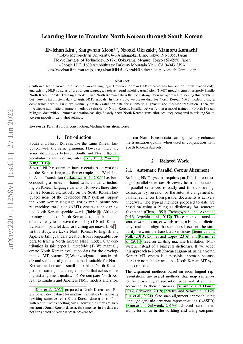 South and North Korea both use the Korean language. However, Korean NLP research has focused on South Korean only, and existing NLP systems of the Korean language, such as neural machine translation (NMT) models, cannot properly handle North Korean inputs. Training a model using North Korean data is the most straightforward approach to solving this problem, but there is insufficient data to train NMT models. In this study, we create data for North Korean NMT models using a comparable corpus. First, we manually create evaluation data for automatic alignment and machine translation. Then, we investigate automatic alignment methods suitable for North Korean. Finally, we verify that a model trained by North Korean bilingual data without human annotation can significantly boost North Korean translation accuracy compared to existing South Korean models in zero-shot settings.