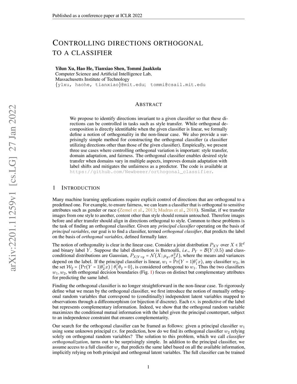 We propose to identify directions invariant to a given classifier so that these directions can be controlled in tasks such as style transfer. While orthogonal decomposition is directly identifiable when the given classifier is linear, we formally define a notion of orthogonality in the non-linear case. We also provide a surprisingly simple method for constructing the orthogonal classifier (a classifier utilizing directions other than those of the given classifier). Empirically, we present three use cases where controlling orthogonal variation is important: style transfer, domain adaptation, and fairness. The orthogonal classifier enables desired style transfer when domains vary in multiple aspects, improves domain adaptation with label shifts and mitigates the unfairness as a predictor. The code is available at http://github.com/Newbeeer/orthogonal_classifier