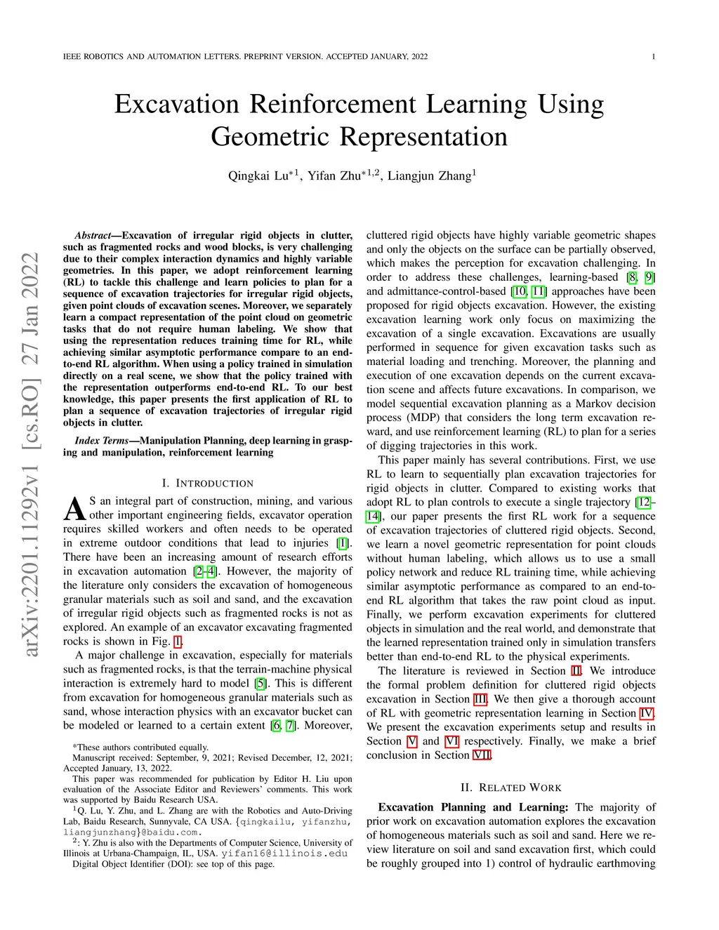 Excavation of irregular rigid objects in clutter, such as fragmented rocks and wood blocks, is very challenging due to their complex interaction dynamics and highly variable geometries. In this paper, we adopt reinforcement learning (RL) to tackle this challenge and learn policies to plan for a sequence of excavation trajectories for irregular rigid objects, given point clouds of excavation scenes. Moreover, we separately learn a compact representation of the point cloud on geometric tasks that do not require human labeling. We show that using the representation reduces training time for RL, while achieving similar asymptotic performance compare to an end-to-end RL algorithm. When using a policy trained in simulation directly on a real scene, we show that the policy trained with the representation outperforms end-to-end RL. To our best knowledge, this paper presents the first application of RL to plan a sequence of excavation trajectories of irregular rigid objects in clutter.