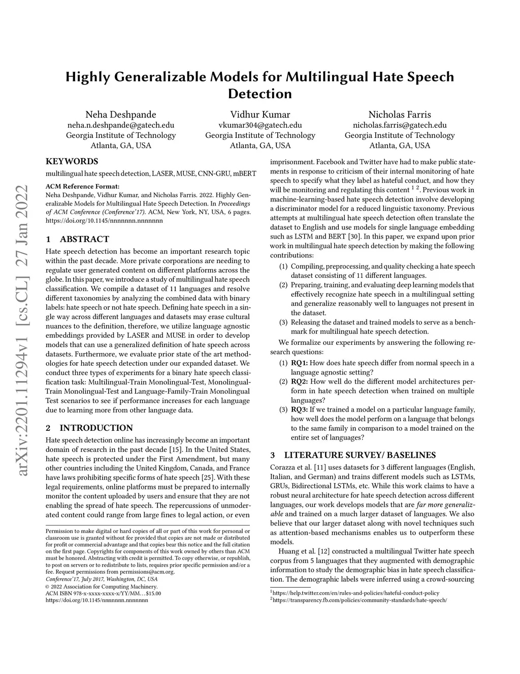 Hate speech detection has become an important research topic within the past decade. More private corporations are needing to regulate user generated content on different platforms across the globe. In this paper, we introduce a study of multilingual hate speech classification. We compile a dataset of 11 languages and resolve different taxonomies by analyzing the combined data with binary labels: hate speech or not hate speech. Defining hate speech in a single way across different languages and datasets may erase cultural nuances to the definition, therefore, we utilize language agnostic embeddings provided by LASER and MUSE in order to develop models that can use a generalized definition of hate speech across datasets. Furthermore, we evaluate prior state of the art methodologies for hate speech detection under our expanded dataset. We conduct three types of experiments for a binary hate speech classification task: Multilingual-Train Monolingual-Test, MonolingualTrain Monolingual-Test and Language-Family-Train Monolingual Test scenarios to see if performance increases for each language due to learning more from other language data.
