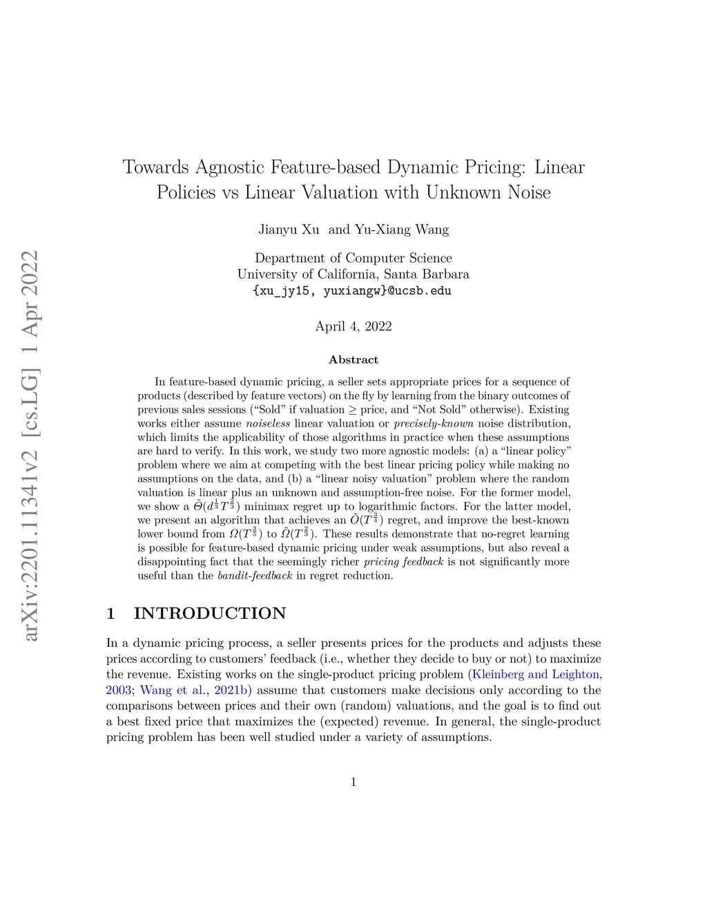 In feature-based dynamic pricing, a seller sets appropriate prices for a sequence of products (described by feature vectors) on the fly by learning from the binary outcomes of previous sales sessions ("Sold" if valuation price, and "Not Sold" otherwise). Existing works either assume noiseless linear valuation or precisely-known noise distribution, which limits the applicability of those algorithms in practice when these assumptions are hard to verify. In this work, we study two more agnostic models: (a) a "linear policy" problem where we aim at competing with the best linear pricing policy while making no assumptions on the data, and (b) a "linear noisy valuation" problem where the random valuation is linear plus an unknown and assumption-free noise. For the former model, we show a minimax regret up to logarithmic factors. For the latter model, we present an algorithm that achieves an regret, and improve the best-known lower bound from to . These results demonstrate that no-regret learning is possible for feature-based dynamic pricing under weak assumptions, but also reveal a disappointing fact that the seemingly richer pricing feedback is not significantly more useful than the bandit-feedback in regret reduction.