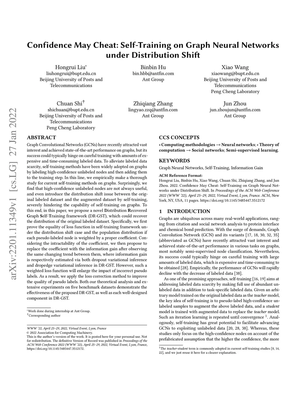Graph Convolutional Networks (GCNs) have recently attracted vast interest and achieved state-of-the-art performance on graphs, but its success could typically hinge on careful training with amounts of expensive and time-consuming labeled data. To alleviate labeled data scarcity, self-training methods have been widely adopted on graphs by labeling high-confidence unlabeled nodes and then adding them to the training step. In this line, we empirically make a thorough study for current self-training methods on graphs. Surprisingly, we find that high-confidence unlabeled nodes are not always useful, and even introduce the distribution shift issue between the original labeled dataset and the augmented dataset by self-training, severely hindering the capability of self-training on graphs. To this end, in this paper, we propose a novel Distribution Recovered Graph Self-Training framework (DR-GST), which could recover the distribution of the original labeled dataset. Specifically, we first prove the equality of loss function in self-training framework under the distribution shift case and the population distribution if each pseudo-labeled node is weighted by a proper coefficient. Considering the intractability of the coefficient, we then propose to replace the coefficient with the information gain after observing the same changing trend between them, where information gain is respectively estimated via both dropout variational inference and dropedge variational inference in DR-GST. However, such a weighted loss function will enlarge the impact of incorrect pseudo labels. As a result, we apply the loss correction method to improve the quality of pseudo labels. Both our theoretical analysis and extensive experiments on five benchmark datasets demonstrate the effectiveness of the proposed DR-GST, as well as each well-designed component in DR-GST.