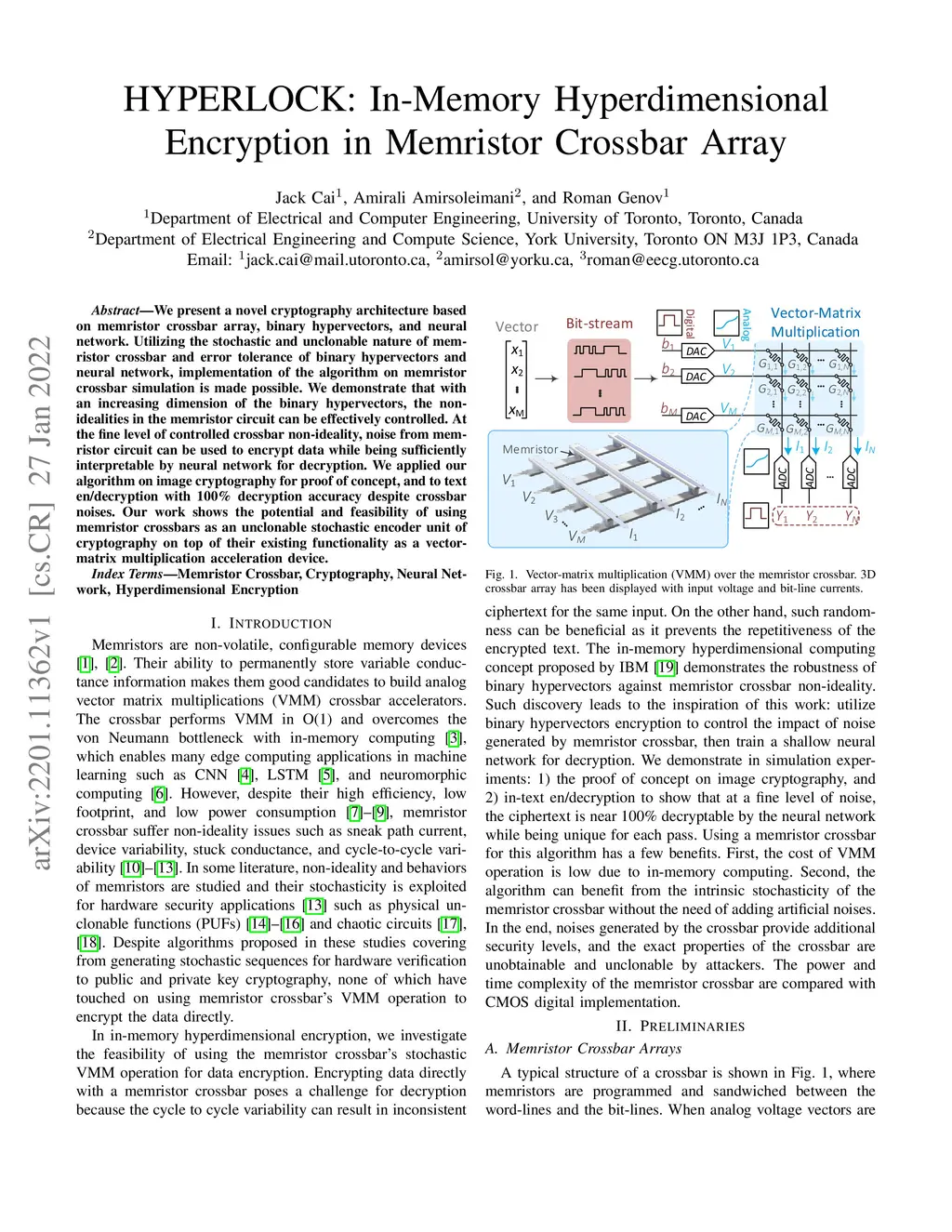 We present a novel cryptography architecture based on memristor crossbar array, binary hypervectors, and neural network. Utilizing the stochastic and unclonable nature of memristor crossbar and error tolerance of binary hypervectors and neural network, implementation of the algorithm on memristor crossbar simulation is made possible. We demonstrate that with an increasing dimension of the binary hypervectors, the non-idealities in the memristor circuit can be effectively controlled. At the fine level of controlled crossbar non-ideality, noise from memristor circuit can be used to encrypt data while being sufficiently interpretable by neural network for decryption. We applied our algorithm on image cryptography for proof of concept, and to text en/decryption with 100% decryption accuracy despite crossbar noises. Our work shows the potential and feasibility of using memristor crossbars as an unclonable stochastic encoder unit of cryptography on top of their existing functionality as a vector-matrix multiplication acceleration device.