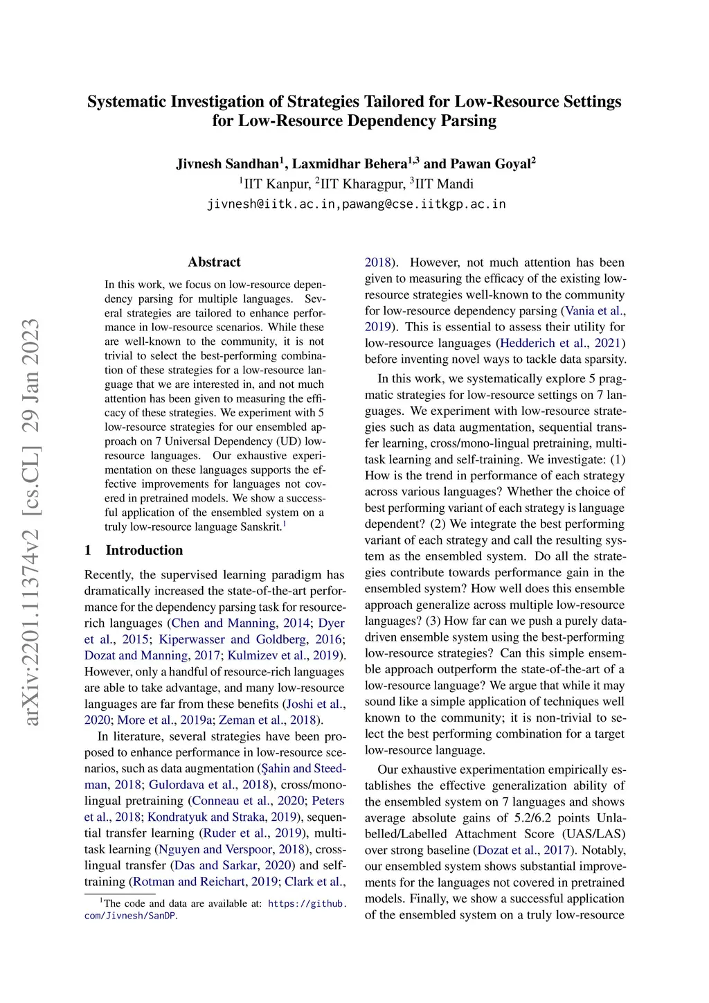 In this work, we focus on low-resource dependency parsing for multiple languages. Several strategies are tailored to enhance performance in low-resource scenarios. While these are well-known to the community, it is not trivial to select the best-performing combination of these strategies for a low-resource language that we are interested in, and not much attention has been given to measuring the efficacy of these strategies. We experiment with 5 low-resource strategies for our ensembled approach on 7 Universal Dependency (UD) low-resource languages. Our exhaustive experimentation on these languages supports the effective improvements for languages not covered in pretrained models. We show a successful application of the ensembled system on a truly low-resource language Sanskrit. The code and data are available at: https://github.com/Jivnesh/SanDP