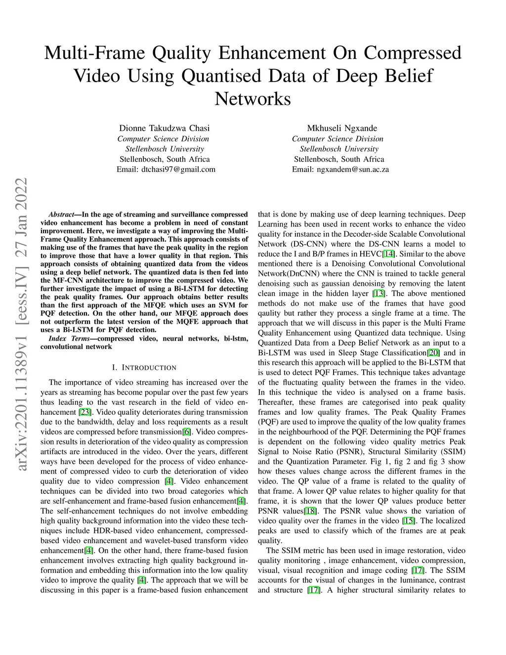 In the age of streaming and surveillance compressed video enhancement has become a problem in need of constant improvement. Here, we investigate a way of improving the Multi-Frame Quality Enhancement approach. This approach consists of making use of the frames that have the peak quality in the region to improve those that have a lower quality in that region. This approach consists of obtaining quantized data from the videos using a deep belief network. The quantized data is then fed into the MF-CNN architecture to improve the compressed video. We further investigate the impact of using a Bi-LSTM for detecting the peak quality frames. Our approach obtains better results than the first approach of the MFQE which uses an SVM for PQF detection. On the other hand, our MFQE approach does not outperform the latest version of the MQFE approach that uses a Bi-LSTM for PQF detection.
