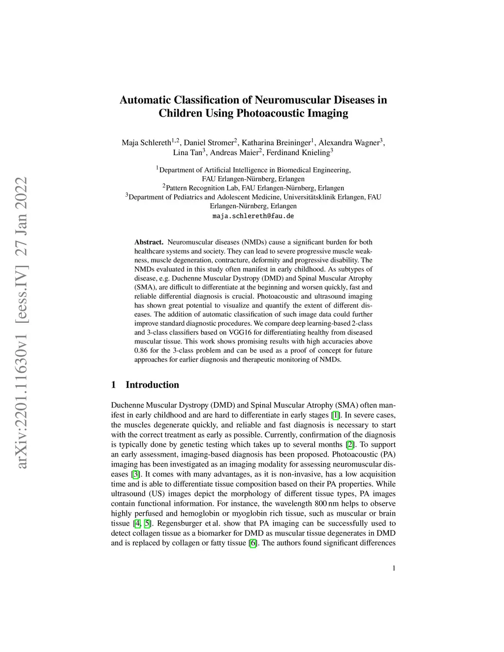 Neuromuscular diseases (NMDs) cause a significant burden for both healthcare systems and society. They can lead to severe progressive muscle weakness, muscle degeneration, contracture, deformity and progressive disability. The NMDs evaluated in this study often manifest in early childhood. As subtypes of disease, e.g. Duchenne Muscular Dystropy (DMD) and Spinal Muscular Atrophy (SMA), are difficult to differentiate at the beginning and worsen quickly, fast and reliable differential diagnosis is crucial. Photoacoustic and ultrasound imaging has shown great potential to visualize and quantify the extent of different diseases. The addition of automatic classification of such image data could further improve standard diagnostic procedures. We compare deep learning-based 2-class and 3-class classifiers based on VGG16 for differentiating healthy from diseased muscular tissue. This work shows promising results with high accuracies above 0.86 for the 3-class problem and can be used as a proof of concept for future approaches for earlier diagnosis and therapeutic monitoring of NMDs.