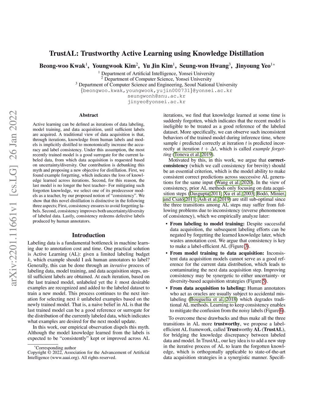 Active learning can be defined as iterations of data labeling, model training, and data acquisition, until sufficient labels are acquired. A traditional view of data acquisition is that, through iterations, knowledge from human labels and models is implicitly distilled to monotonically increase the accuracy and label consistency. Under this assumption, the most recently trained model is a good surrogate for the current labeled data, from which data acquisition is requested based on uncertainty/diversity. Our contribution is debunking this myth and proposing a new objective for distillation. First, we found example forgetting, which indicates the loss of knowledge learned across iterations. Second, for this reason, the last model is no longer the best teacher -- For mitigating such forgotten knowledge, we select one of its predecessor models as a teacher, by our proposed notion of "consistency". We show that this novel distillation is distinctive in the following three aspects; First, consistency ensures to avoid forgetting labels. Second, consistency improves both uncertainty/diversity of labeled data. Lastly, consistency redeems defective labels produced by human annotators.
