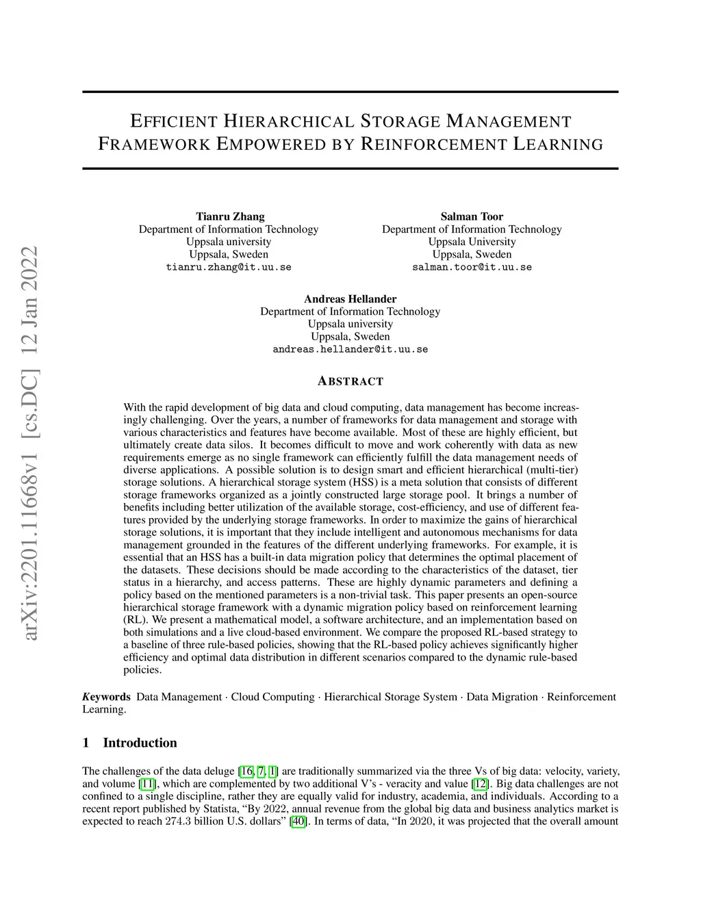 With the rapid development of big data and cloud computing, data management has become increasingly challenging. Over the years, a number of frameworks for data management and storage with various characteristics and features have become available. Most of these are highly efficient, but ultimately create data silos. It becomes difficult to move and work coherently with data as new requirements emerge as no single framework can efficiently fulfill the data management needs of diverse applications. A possible solution is to design smart and efficient hierarchical (multi-tier) storage solutions. A hierarchical storage system (HSS) is a meta solution that consists of different storage frameworks organized as a jointly constructed large storage pool. It brings a number of benefits including better utilization of the storage, cost-efficiency, and use of different features provided by the underlying storage frameworks. In order to maximize the gains of hierarchical storage solutions, it is important that they include intelligent and autonomous mechanisms for data management grounded in the features of the different underlying frameworks. These decisions should be made according to the characteristics of the dataset, tier status, and access patterns. These are highly dynamic parameters and defining a policy based on the mentioned parameters is a non-trivial task. This paper presents an open-source hierarchical storage framework with a dynamic migration policy based on reinforcement learning (RL). We present a mathematical model, a software architecture, and an implementation based on both simulations and a live cloud-based environment. We compare the proposed RL-based strategy to a baseline of three rule-based policies, showing that the RL-based policy achieves significantly higher efficiency and optimal data distribution in different scenarios compared to the dynamic rule-based policies.