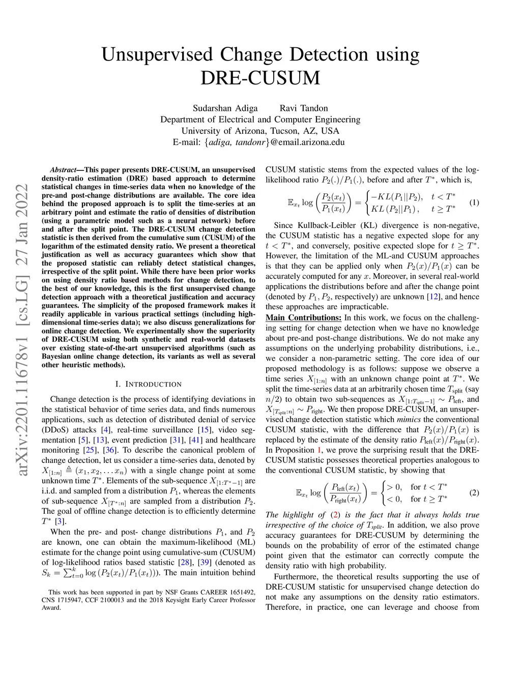 This paper presents DRE-CUSUM, an unsupervised density-ratio estimation (DRE) based approach to determine statistical changes in time-series data when no knowledge of the pre-and post-change distributions are available. The core idea behind the proposed approach is to split the time-series at an arbitrary point and estimate the ratio of densities of distribution (using a parametric model such as a neural network) before and after the split point. The DRE-CUSUM change detection statistic is then derived from the cumulative sum (CUSUM) of the logarithm of the estimated density ratio. We present a theoretical justification as well as accuracy guarantees which show that the proposed statistic can reliably detect statistical changes, irrespective of the split point. While there have been prior works on using density ratio based methods for change detection, to the best of our knowledge, this is the first unsupervised change detection approach with a theoretical justification and accuracy guarantees. The simplicity of the proposed framework makes it readily applicable in various practical settings (including high-dimensional time-series data); we also discuss generalizations for online change detection. We experimentally show the superiority of DRE-CUSUM using both synthetic and real-world datasets over existing state-of-the-art unsupervised algorithms (such as Bayesian online change detection, its variants as well as several other heuristic methods).